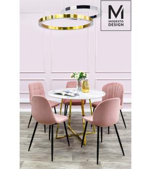Krzesło CARLO w kolorze pudrowy róż od MODESTO DESIGN. Prosta i funkcjonalna forma, łącząca w sobie modną pikowaną tkaninę i metalowe nogi. Wyprofilowane oparcie i miękkie siedzisko zapewniają komfortowe użytkowanie. Całość tapicerowana jest modnym i przyjemnym w dotyku welurem. Stabilność i wytrzymałość zapewnia konstrukcja z metalu w kolorze czarnym....