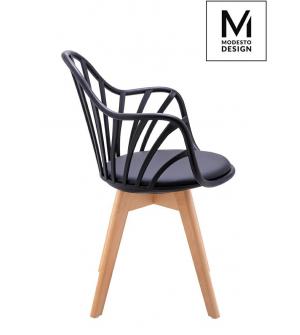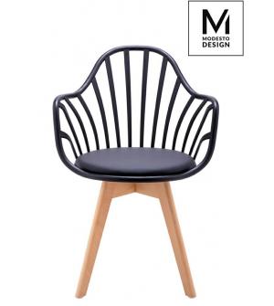 MODESTO krzesło ALBERT ARM marki MODESTO DESIGN. Klasyczne krzesło w nowoczesnym wydaniu. Konstrukcja wykonana z polipropylenu w kolorze czarnym matowym. Na siedzisku znajduje się miękka poduszka, tapicerowana czarną ekoskórą. Podstawa wykonana z naturalnego drewna bukowego. Doskonały fotel do jadalni lub salonu, sprawdzi się też przy biurku.Waga netto...
