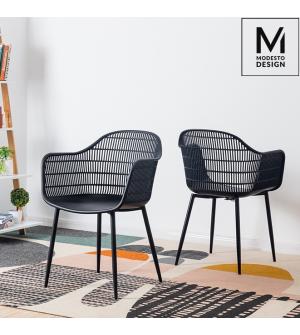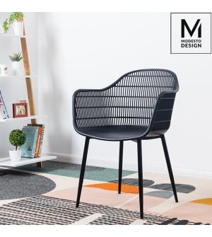 Krzesło BASKET ARM od MODESTO DESIGN. Siedzisko wykonane zostało w całości z polipropylenu w kolorze czarnym matowym. Szerokie siedzisko oraz metalowa podstawa, zapewniają odpowiedni komfort. Wzór siatki zastosowany na oparciu, poprawia wentylację. Zobacz też krzesło Basket w wersji bez podłokietników.Waga netto 1 szt.: 4,7 kg Waga opakowania: 5 kg...