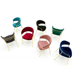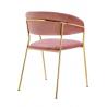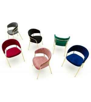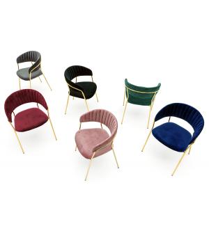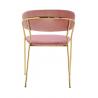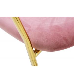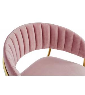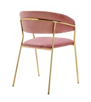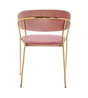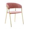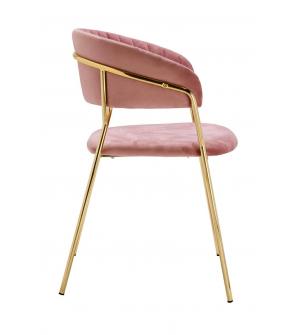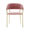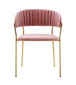 Krzesło Margo w modnym kolorze brudnego różu. Siedzisko i oparcie tapicerowane miękkim i przyjemnym w dotyku welurem. Konstrukcja z metalu w kolorze złotym, błyszczącym. Margo to doskonałe połączenie modnej tkaniny ze złotem. Pionowe przeszycia na oparciu dodają elegancji. Krzesło idealnie pasujące do wnętrz nowoczesnych i klasycznych.Szerokość...