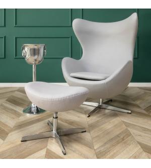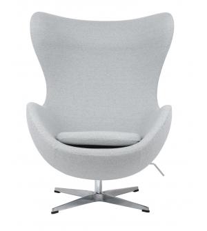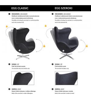 Fotel EGG CLASSIC to klasyka sama w sobie. Jeden z najbardziej znanych kształtów fotela. Fotel tapicerowany jest wełną kaszmirową (70% wełna naturalna, 30% poliester). Tkanina ta słynie z wyjątkowej wytrzymałości. Wyposażony jest w mechanizm obrotowy z funkcją bujania. Korpus fotela wykonany jest z włókna szklanego. Podstawa oraz uchwyt wykonane ze stali...