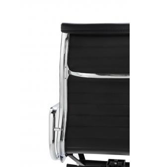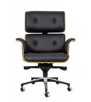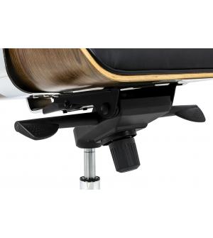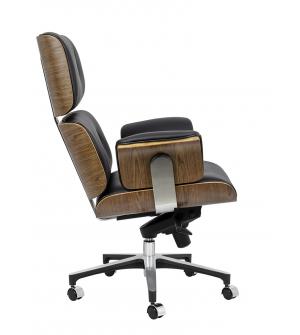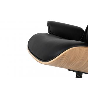 Fotel biurowy LOUNGE BUSINESS czarny z orzechowym drewnem. Siedzisko, oparcie oraz podłokietniki tapicerowane są włoską skórą naturalną w kolorze czarnym. Korpus fotela został wykonany z giętego na ciepło drewna w kolorze orzechowym o grubości 55 mm. Podstawa oraz elementy metalowe wykonane zostały ze stali polerowanej. Fotel wyposażony jest w obrotową...