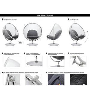 Designerski fotel Bubble Stand 2 zapewni relaks i odprężenie. Korpus fotela wykonany został z wysokiej jakości przezroczystego akrylu. Wewnątrz umieszczono, dwie miękkie poduchy, tapicerowane wełną kaszmirową. Korpus umieszczony jest na stojaku ze stali chromowanej. Dwa uchwyty podtrzymują korpus, umożliwiając swobodne i bezpieczne korzystanie z fotela....