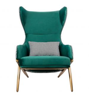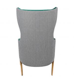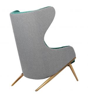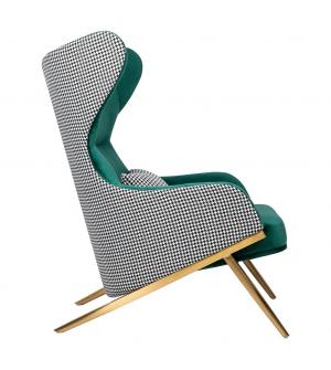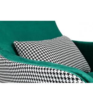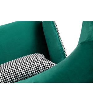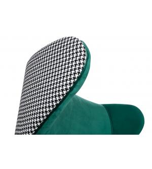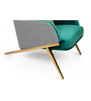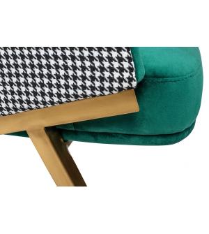 Fotel HAMPTON. Siedzisko tapicerowane jest aksamitnym welurem w kolorze ciemnozielonym. Tył fotela oraz poduszka zostały obszyte tkaniną w biało-czarną pepitkę. Metalowa podstawa o ciekawym kształcie w kolorze złotym podkreśla nowoczesny charakter fotela.Możliwość personalizacji obicia, wyjątkowy design oraz solidne wykonanie sprawia, że Hampton...