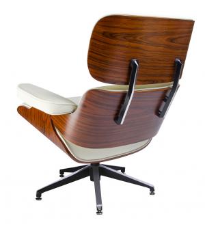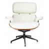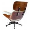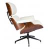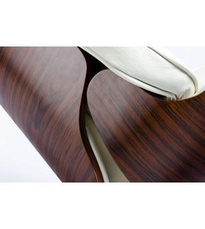 Fotel LOUNGE biały z różanym drewnem. Siedzisko, oparcie oraz podłokietniki tapicerowane są skórą naturalną w kolorze białym. Korpus fotela został wykonany z giętego na ciepło drewna w kolorze różanym. Podstawa oraz elementy metalowe wykonane zostały ze stali, malowanej proszkowo na kolor czarny matowy. Dla podkreślenia elegancji, podstawa oraz łączenia...