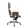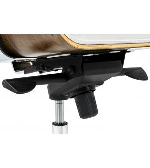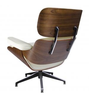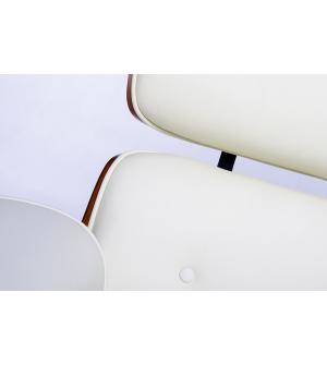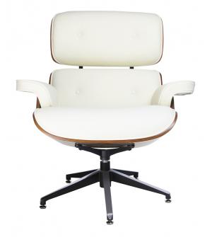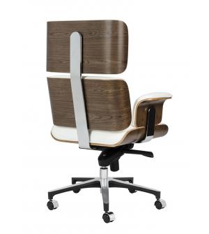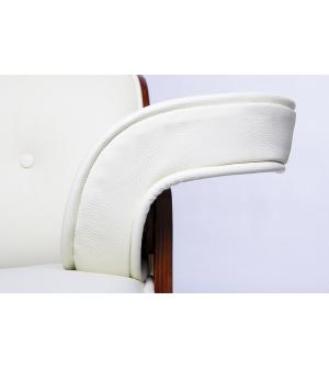 Fotel biurowy LOUNGE BUSINESS biały z orzechowym drewnem. Siedzisko, oparcie oraz podłokietniki tapicerowane są włoską skórą naturalną w kolorze białym. Korpus fotela został wykonany z giętego na ciepło drewna w kolorze orzechowym o grubości 55 mm. Podstawa oraz elementy metalowe wykonane zostały ze stali polerowanej w standardzie BIMFA. Fotel wyposażony...