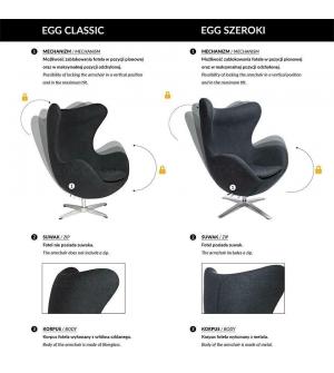 Fotel EGG SZEROKI kształtem nawiązuje do jednego z najbardziej znanych projektów. Fotel wyposażony jest w mechanizm obrotowy z funkcją bujania. Dodatkowo fotel można zablokować w pozycji odchylonej lub pionowej. Ciekawym elementem, jest dekoracyjny suwak na plecach fotela. Fotel tapicerowany jest wełną kaszmirową (70% wełna naturalna, 30% poliester)....