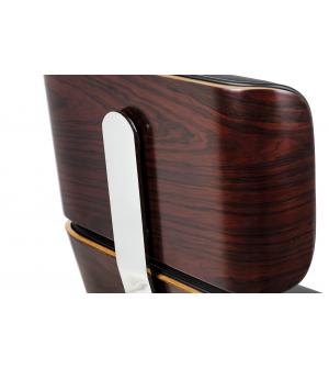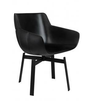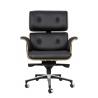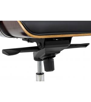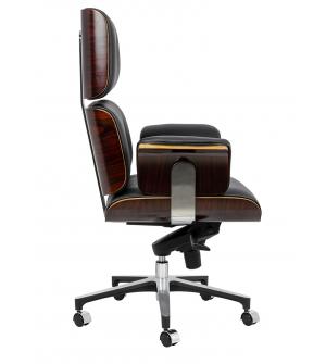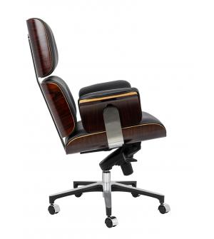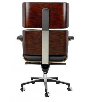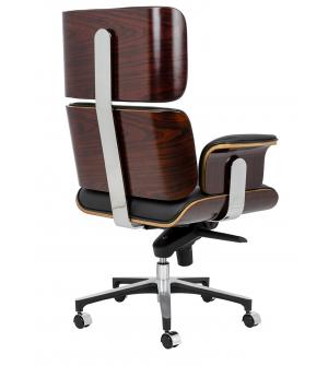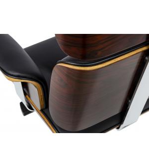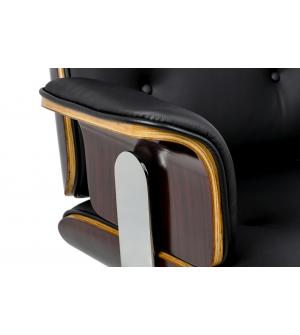 Fotel biurowy LOUNGE BUSINESS czarny z różanym drewnem. Siedzisko, oparcie oraz podłokietniki tapicerowane są włoską skórą naturalną w kolorze czarnym. Korpus fotela został wykonany z giętego na ciepło drewna w kolorze różanym o grubości 55 mm. Podstawa oraz elementy metalowe wykonane zostały ze stali polerowanej w standardzie BIMFA. Fotel wyposażony jest...