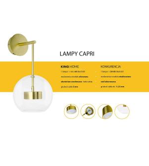 Kinkiet Capri Wall 4 składa się z kulistych, szklanych kloszy oraz aluminium.Główny klosz umieszczony jest na aluminiowym ramieniu w złotym kolorze.Do niego przymocowane są mniejsze klosze.Wewnątrz głównego klosza znajduje się źródło światła LED.Snop światła skierowany jest zarówno do dołu oraz do góry.Dzięki temu tworzy to bardzo przyjemny i elegancki...