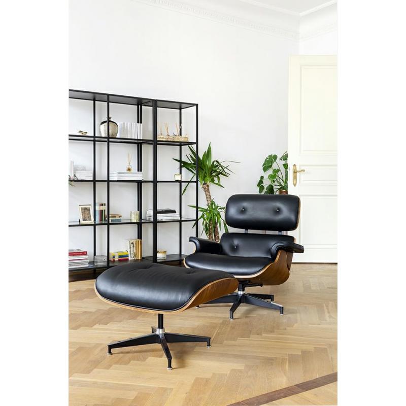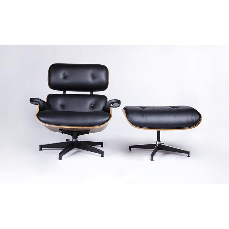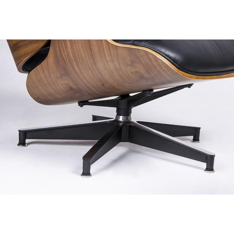 Fotel LOUNGE HM PREMIUM SZEROKI czarny z podnóżkiem z orzechowym drewnem. Cały fotel wraz z podnóżkiem tapicerowane są naturalną włoską skórą w kolorze czarnym. Zarówno korpus fotela jak i podnóżka został wykonany z giętego na ciepło drewna w kolorze orzechowym. Podstawy oraz elementy metalowe wykonane zostały ze stali, malowanej proszkowo na kolor czarny matowy. Dla podkreślenia elegancji, obie podstawy oraz łączenia oparcia w fotelu są dodatkowo spolerowane na wierzchniej stronie. Fotel oraz p