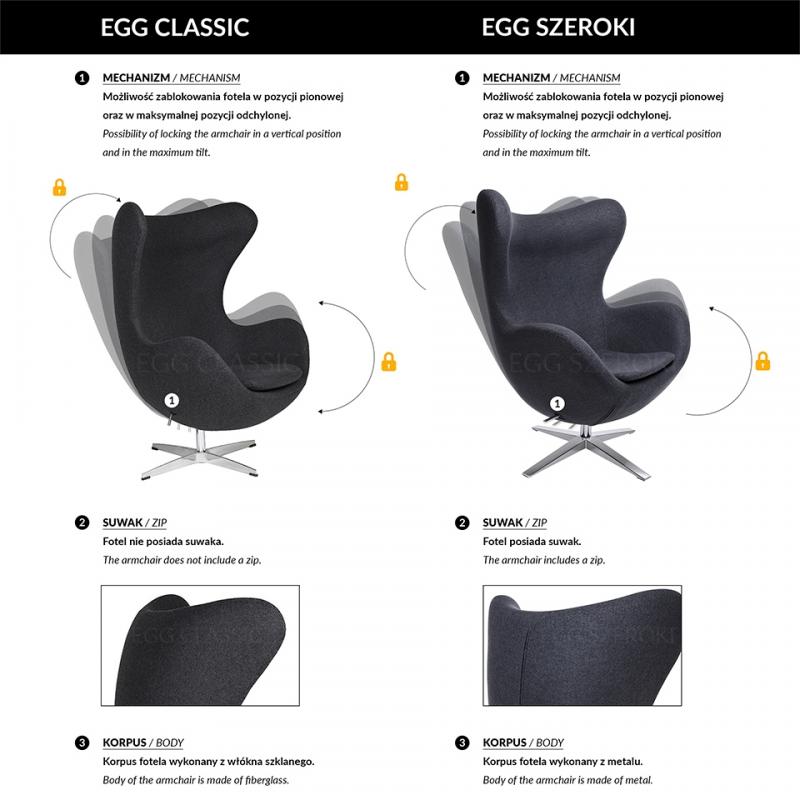 Fotel EGG CLASSIC BLACK to klasyka sama w sobie. Jeden z najbardziej znanych kształtów fotela. Fotel tapicerowany jest wełną kaszmirową (70% wełna naturalna, 30% poliester). Tkanina ta słynie z wyjątkowej wytrzymałości. Fotel wyposażony jest w mechanizm obrotowy z funkcją bujania. Korpus fotela wykonany jest z włókna szklanego. Podstawa oraz uchwyt wykonane z aluminium lakierowanego na kolor czarny matowy.Waga netto 1 szt.: 29 kg Waga opakowania: 30 kg Sposób wysyłki: Paleta Wymiary opakowania
