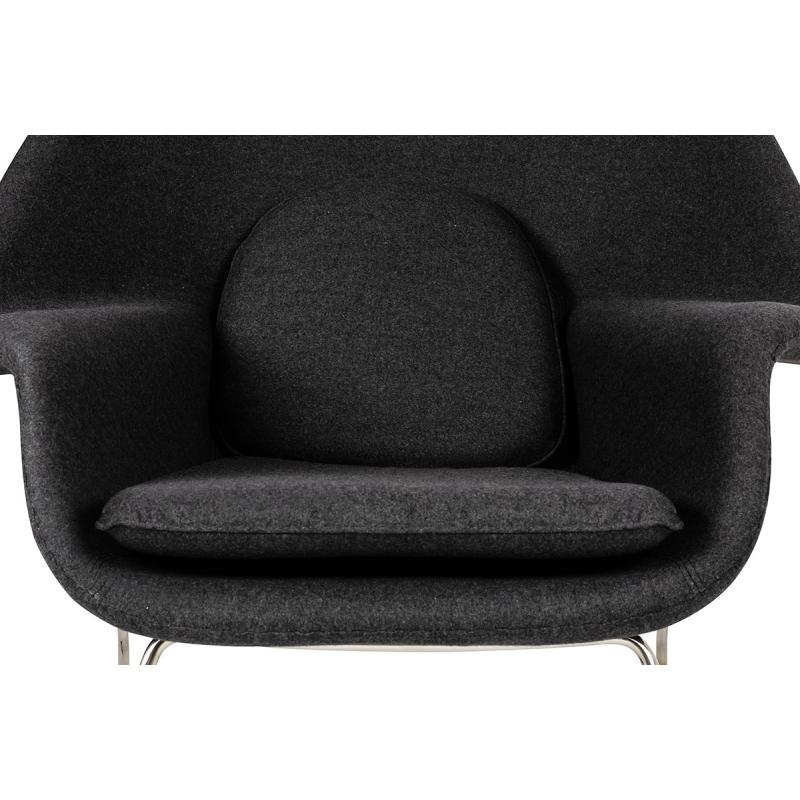 Fotel Cozy z podnóżkiem. Wyprofilowany kształt fotela zapewnia wyjątkowy komfort siedzenia i pozwala całkowicie się odprężyć. Praktyczny podnóżek, który może też służyć jako wygodna pufa. Fotel oraz podnóżek tapicerowane są Wełną kaszmirową (70% wełna naturalna, 30% poliester) w kolorze grafitowy szary. Wełna kaszmirowa słynie z wyjątkowej wytrzymałości. Korpus fotela wykonany jest z włókna szklanego. Podstawa fotela oraz podnóżka zrobione są ze stali polerowanej. Cozy doskonale sprawdzi się w
