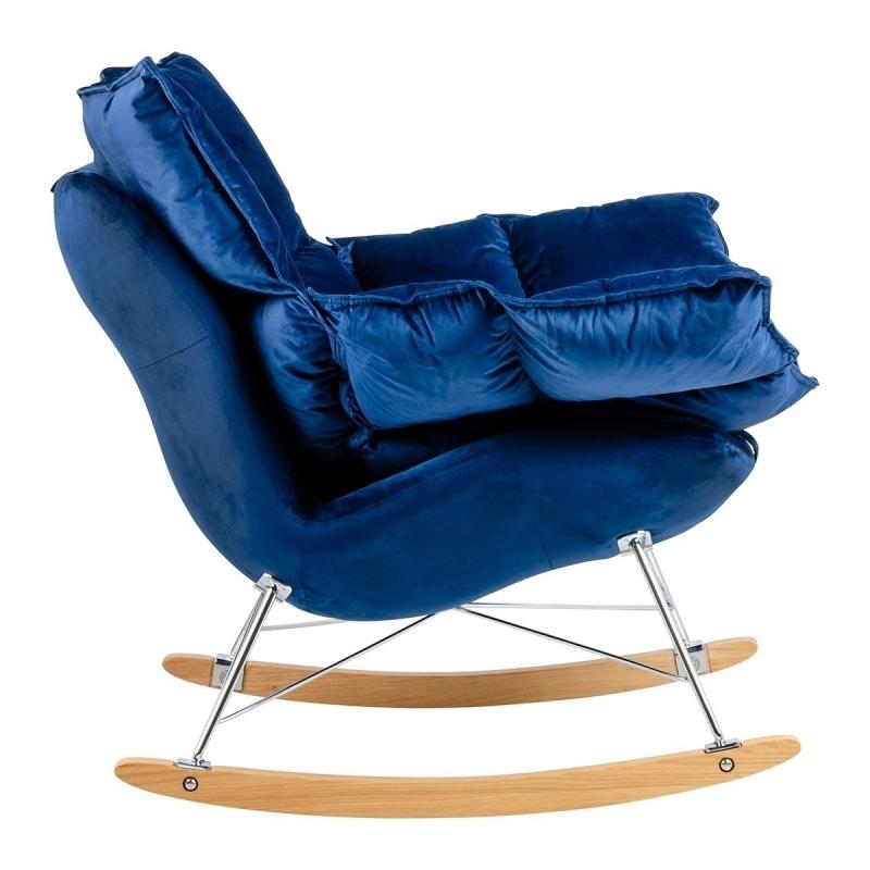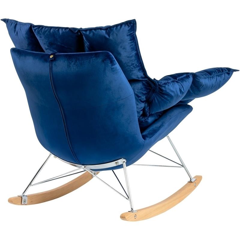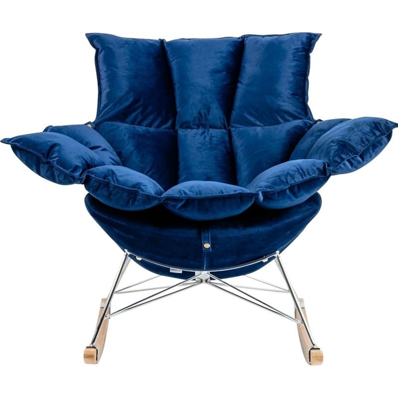 Fotel bujany SWING VELVET. Korpus tapicerowany welurem, wykonany jest z tworzywa sztucznego. Miękka poducha obszyta ciemnoniebieskim aksamitnym welurem. Poduchę można w łatwy sposób odpiąć od korpusu. Stelaż ze stali chromowanej. Płozy wykonane z drewna bukowego.Waga netto 1 szt.: 9 kg Waga opakowania: 14 kg Sposób wysyłki: Paczka Wymiary opakowania: 95 cm x 76 cm x 54 cm Produkt do samodzielnego montażu: Tak