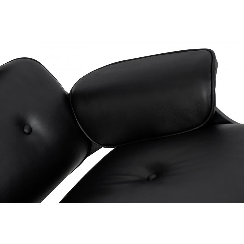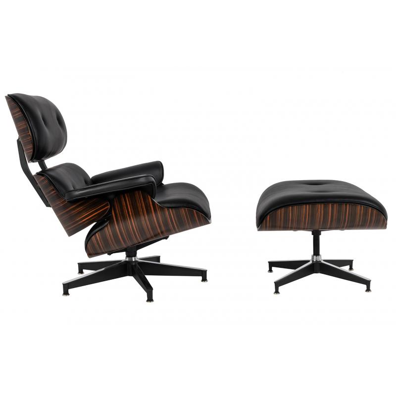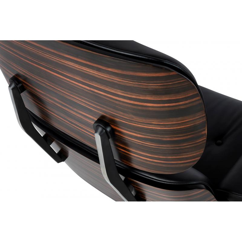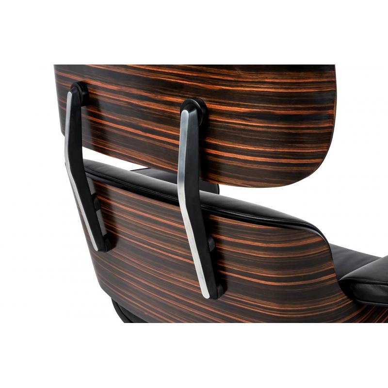 Fotel LOUNGE HM PREMIUM SZEROKI czarny z podnóżkiem z hebanowym drewnem. Cały fotel wraz z podnóżkiem tapicerowane są naturalną włoską skórą w kolorze czarnym. Zarówno korpus fotela jak i podnóżka został wykonany z giętej sklejki fornirowanej drewnem hebanowym Podstawy oraz elementy metalowe wykonane zostały ze stali, malowanej proszkowo na kolor czarny matowy. Dla podkreślenia elegancji, obie podstawy oraz łączenia oparcia w fotelu są dodatkowo spolerowane na wierzchniej stronie. Fotel oraz pod