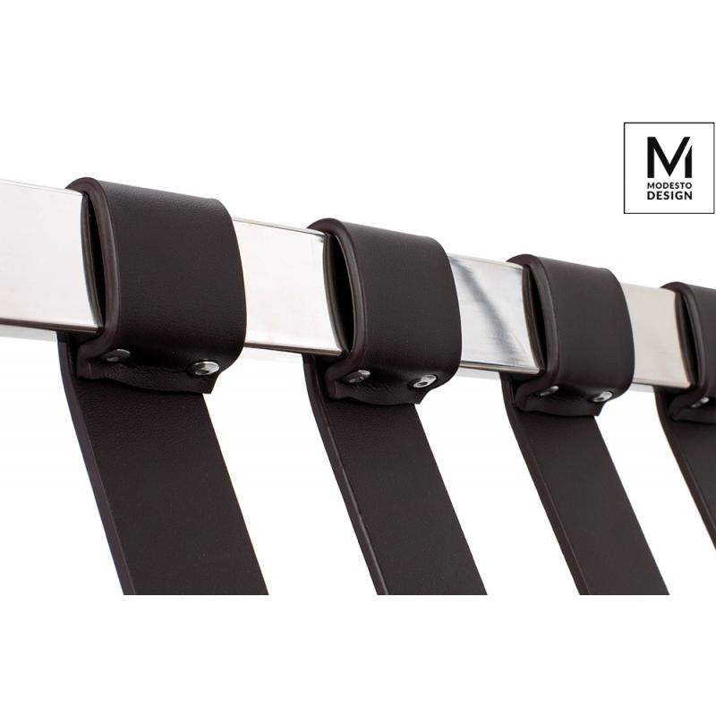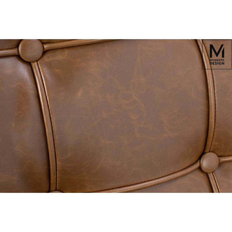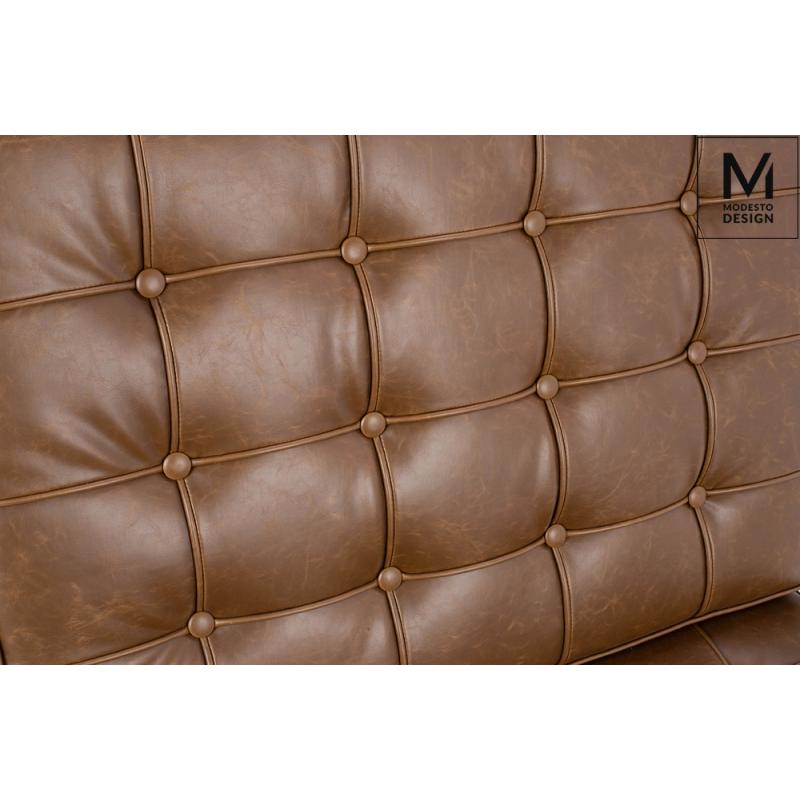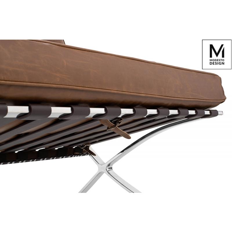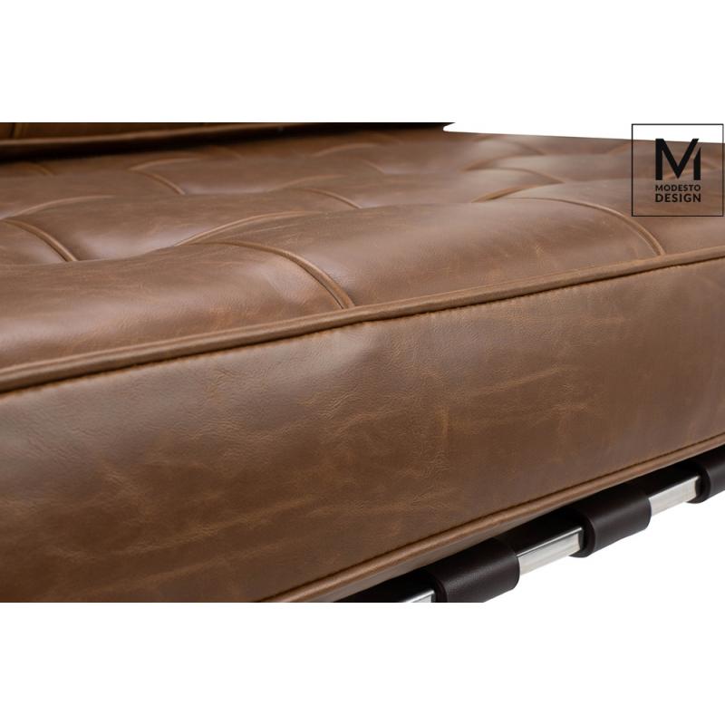 Fotel Barcelon marki Modesto Design stanowi jednoosobową mini sofę, której szerokość pozwala wygodnie się rozsiąść i wypocząć. Siedzisko zostało wykonane w całości z ekoskóry w kolorze brązowym vintage. Z kolei stelaż i nóżki fotela zrobione są ze stali nierdzewnej polerowanej, co dodaje elegancji. Dodatkowo wewnątrz całego stelaża jest stalowy rdzeń który wzmacnia konstrukcję i zapewnia stabilność. Meble w stylu vintage to rozwiązanie dla prawdziwych indywidualistów. Pozwolą stworzyć nietuzi