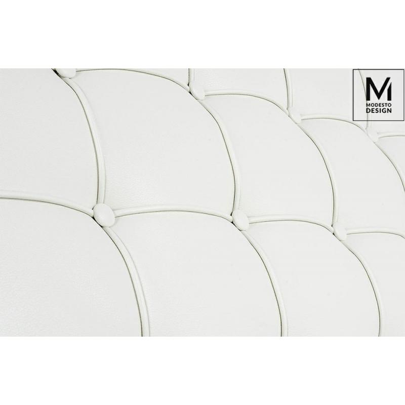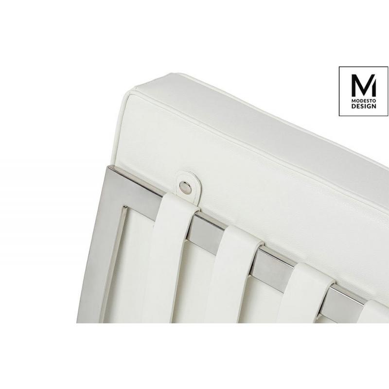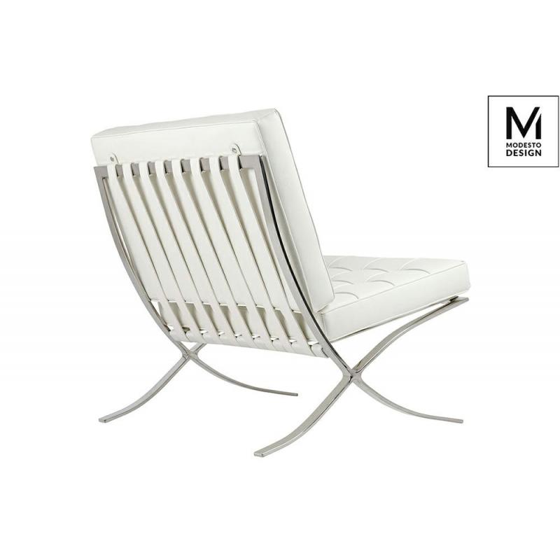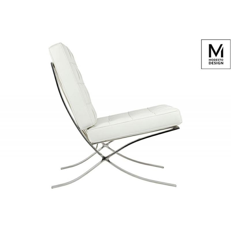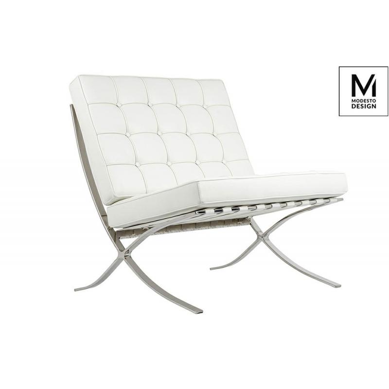Fotel Barcelon marki Modesto Design stanowi jednoosobową mini sofę, której szerokość 75 cm pozwala wygodnie się rozsiąść i wypocząć. Siedzisko jest na wysokości 46 cm i zostało wykonane w całości z ekoskóry w kolorze białym. Z kolei stelaż i nóżki fotela zrobione są ze stali nierdzewnej polerowanej, co dodaje elegancji. Dodatkowo wewnątrz całego stelaża jest stalowy rdzeń który wzmacnia konstrukcję i zapewnia stabilność. Klasyczny i minimalistyczny styl powoduje, że mebel będzie pasował do du