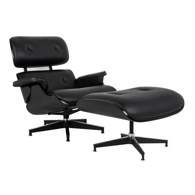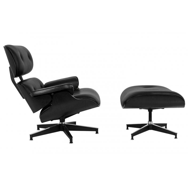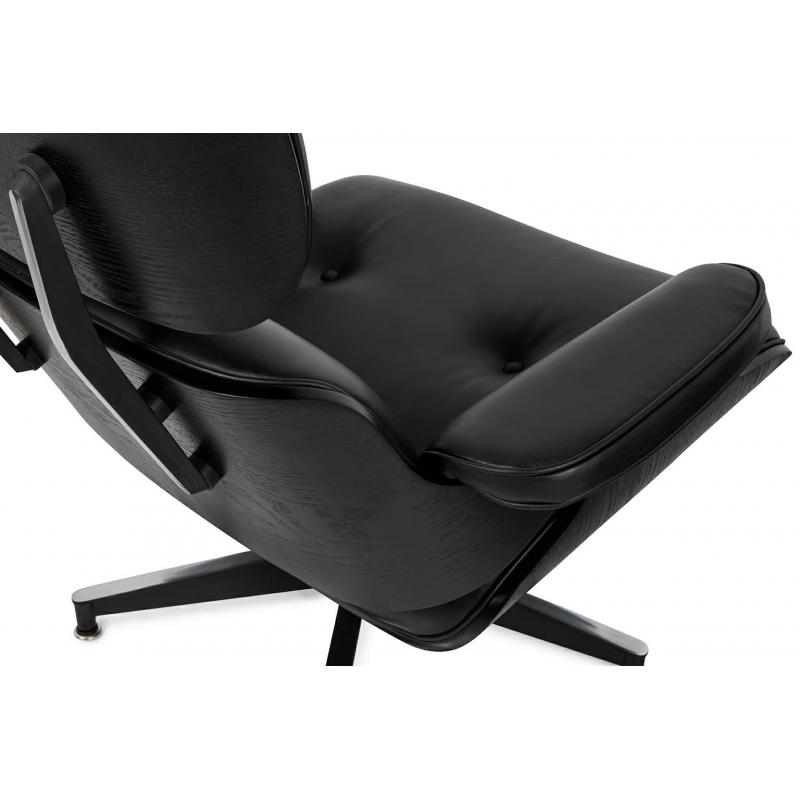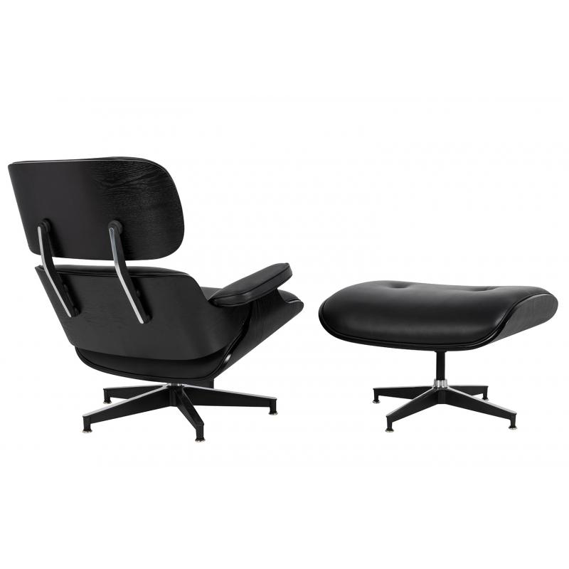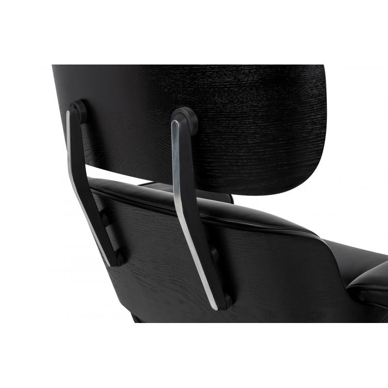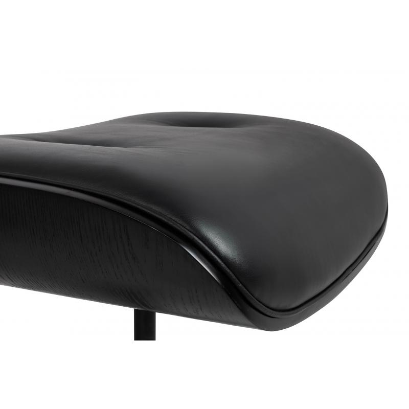 Fotel LOUNGE HM PREMIUM SZEROKI z podnóżkiem z drewnem z czarnego jesionu. Cały fotel wraz z podnóżkiem tapicerowane są naturalną włoską skórą w kolorze czarnym. Zarówno korpus fotela jak i podnóżka został wykonany z giętej sklejki fornirowanej drewnem jesionowym. Podstawy oraz elementy metalowe wykonane zostały ze stali, malowanej proszkowo na kolor czarny matowy. Dla podkreślenia elegancji, obie podstawy oraz łączenia oparcia w fotelu są dodatkowo spolerowane na wierzchniej stronie. Fotel oraz