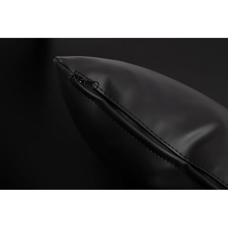 Fotel LAZY. Siedzisko oraz dekoracyjne poduszki w całości tapicerowane są czarną ekoskórą. Szeroka metalowa podstawa lakierowana na kolor czarny sprawia, że konstrukcja fotela jest niezwykle stabilna, co zapewnia wygodę i komfort. Głębokość siedziska możemy zmieniać w zależności od ilości wykorzystanych poduszek.Możliwość personalizacji obicia ,wyjątkowy design oraz solidne wykonanie sprawia, że Lazy doskonale odnajdzie się w każdej aranżacji.Wymiary poduszek: 50 cm x 47 cm x 5 cm ; 40 cm x