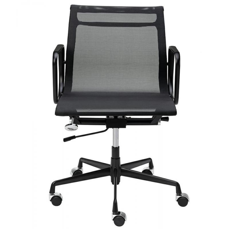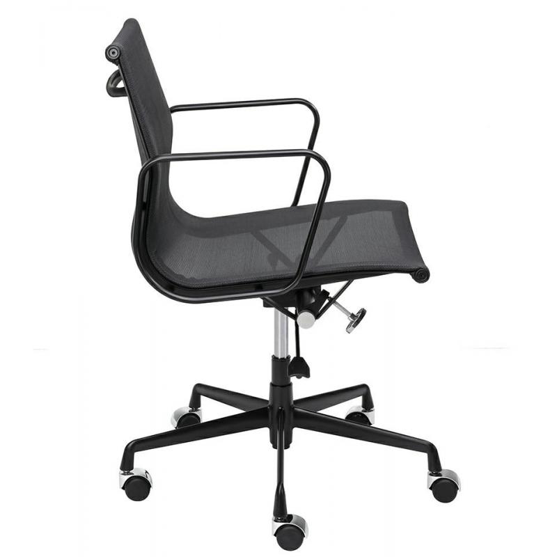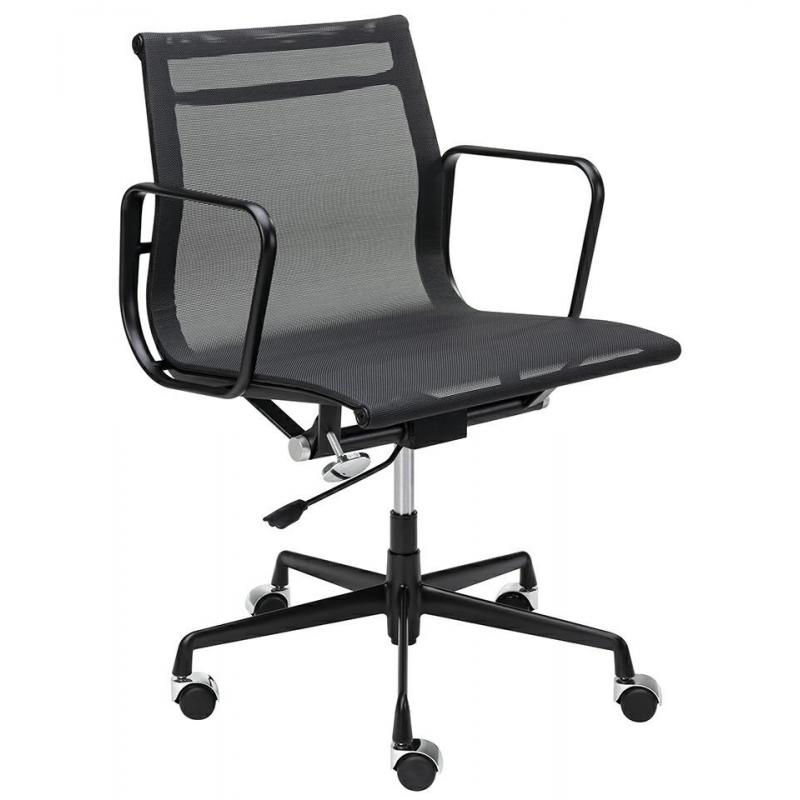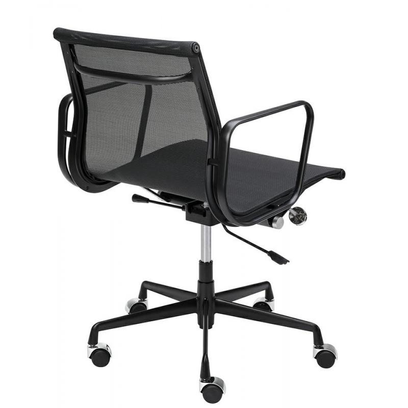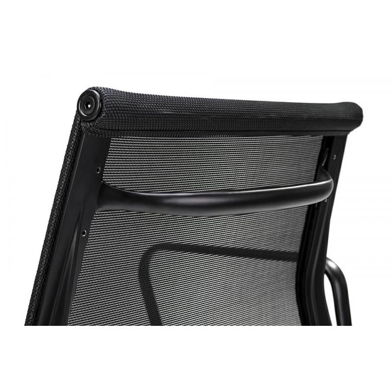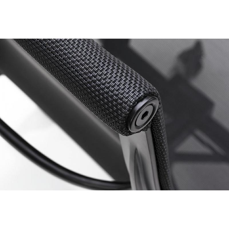 Fotel biurowy Body Prestige w kolorze czarnym. Minimalistyczna forma która wprowadzi elegancki akcent do twojego biura. Cała konstrukcja wykonana jest wytrzymałego aluminium w czarnym, satynowym kolorze. Siedzisko i oparcie tapicerowane są czarną tkaniną w drobną siateczkę. Chromowane kółeczka oraz przeszycia na skórze, podkreślają charakter fotela. Fotel jest obrotowy z funkcją bujania oraz regulacją wysokości w zakresie 11 cm. Wyprofilowane oparcie i siatkowa tkanina zapewnią odpowiedni komfor