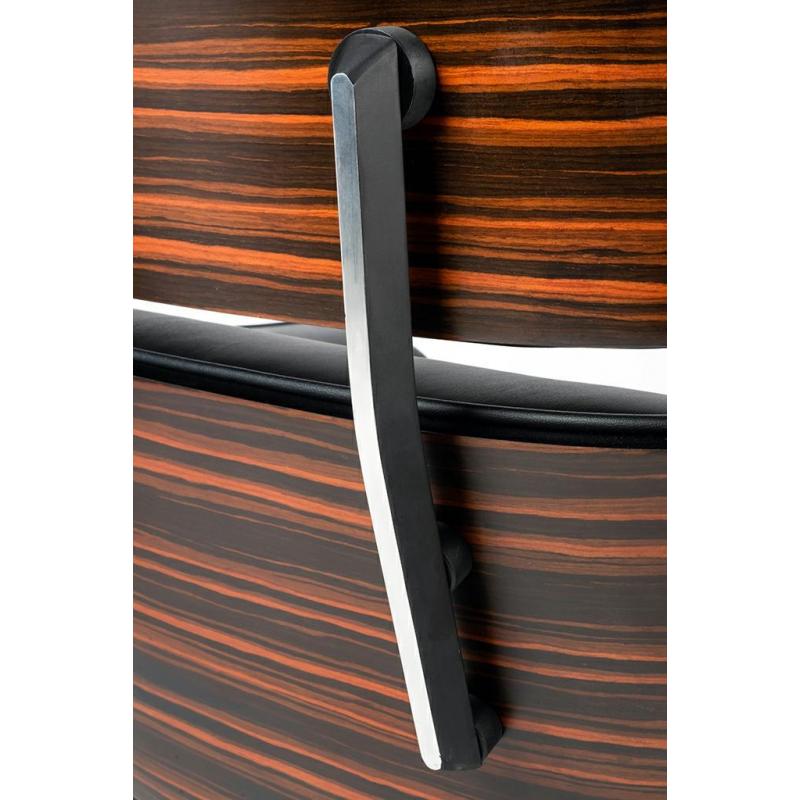 Fotel LOUNGE czarny. Siedzisko, oparcie oraz podłokietniki tapicerowane są skórą naturalną w kolorze czarnym. Korpus fotela został wykonany z giętej sklejki fornirowanej drewnem hebanowym. Podstawa oraz elementy metalowe wykonane ze stali malowanej proszkowo na kolor czarny matowy. Dla podkreślenia elegancji podstawa oraz łączenia oparcia są dodatkowo spolerowane na wierzchniej stronie. Fotel jest obrotowy oraz wyposażony w podwyższoną podstawę, dzięki czemu zyskuje na funkcjonalności. Lounge do