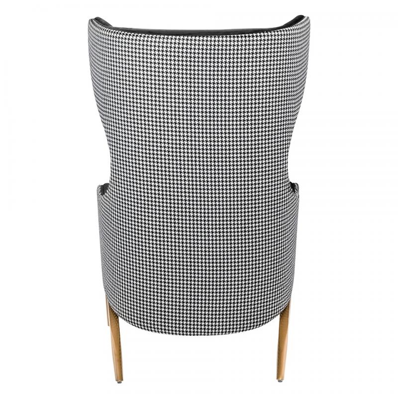 Fotel HAMPTON VELVET czarny / pepitka. Siedzisko tapicerowane jest aksamitnym, czarnym welurem, a tył fotela oraz poduszka zostały obszyte tkaniną w biało-czarną pepitkę. Metalowa podstawa o ciekawym kształcie w kolorze złotym podkreśla nowoczesny charakter fotela. Wyjątkowy design oraz solidne wykonanie sprawia, że Hampton doskonale odnajdzie się w każdej aranżacji.Głębokość siedziska: 59 cm Wymiar poduszki: 45 cm x 30 cm x 6 cm Waga netto 1 szt.: 26 kg Sposób wysyłki: Paleta.