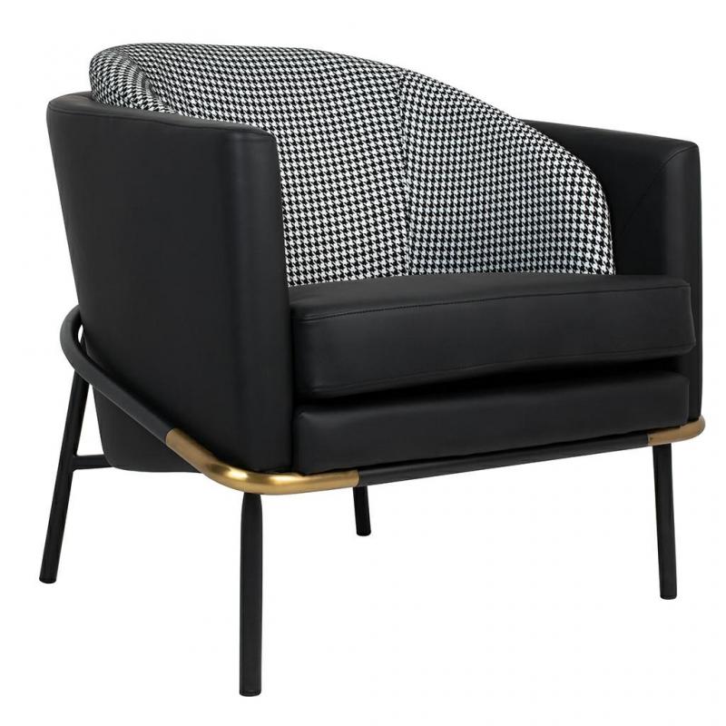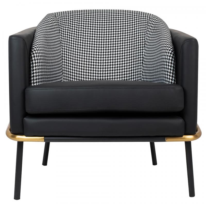 Fotel GUBI. Tył fotela wraz z podłokietnikami i siedziskiem tapicerowany jest ekoskórą w kolorze czarnym. Oparcie obszyte jest tkaniną w biało-czarną pepitkę, a czarna, metalowa podstawa została udekorowana złotymi wstawkami. Nowoczesny design, połączenie kolorów oraz solidne wykonanie sprawia, że Gubi doskonale odnajdzie się w każdej aranżacji.Głębokość siedziska: 50 cm Waga netto 1 szt.: 18 kg Sposób wysyłki: Paleta.