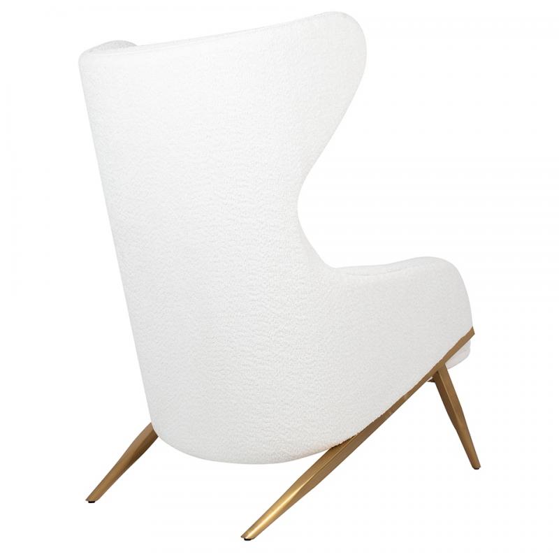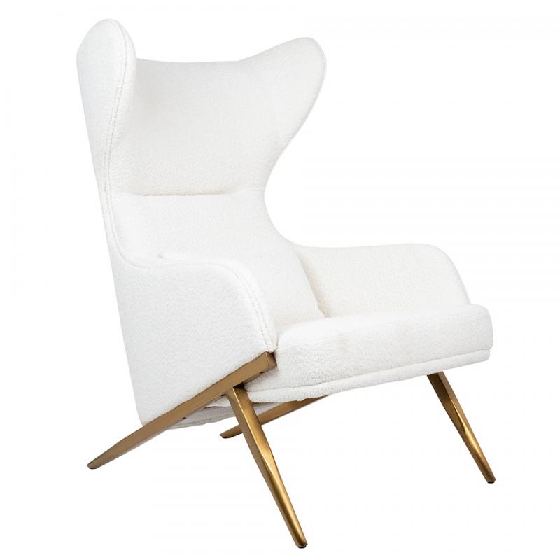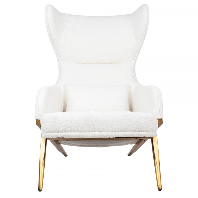 Fotel HAMPTON TEDDY biały. Wygodny fotel w miękkiej i przyjemnej w dotyku tkaninie teddy wykonanej z poliestru (95%) oraz akrylu (5%). Metalowa podstawa o ciekawym kształcie w kolorze złotym podkreśla nowoczesny charakter fotela. Wyjątkowy design oraz solidne wykonanie sprawia, że Hampton doskonale odnajdzie się w nowoczesnych wnętrzach.Głębokość siedziska: 59 cm Wymiar poduszki: 45 cm x 30 cm x 6 cm Waga netto 1 szt.: 26 kg Sposób wysyłki: Paleta.