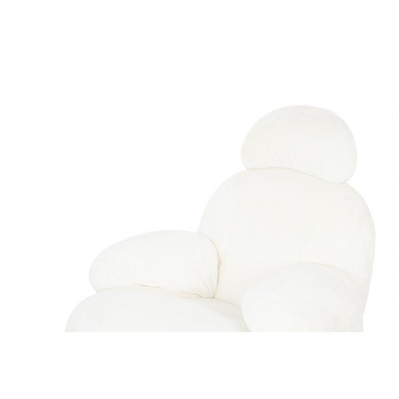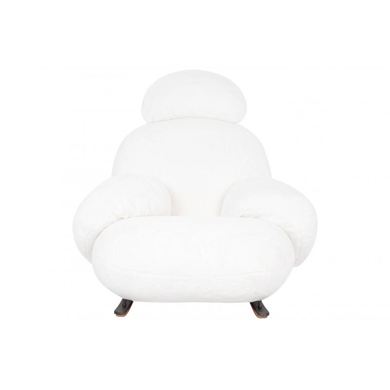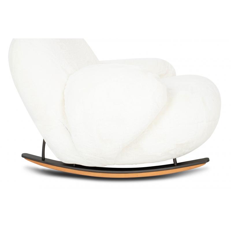 Fotel bujany PLUSH FUR biały. Niezwykle wygodny fotel tapicerowany miękką i przyjemną w dotyku tkaniną teddy wykonaną z poliestru (95%) oraz akrylu (5%). Kształtem nawiązuje do dużego pluszaka, dzięki czemu będzie głównym elementem dekoracyjnym każdej aranżacji. Dębowe płozy nawiązują do tradycji i potęgują komfort wypoczynku.Szerokość siedziska: 71 cm Głębokość siedziska: 54 cm Wysokość oparcia bez zagłówka: 50 cm Szerokość oparcia: 63 cm Wysokość zagłówka: 22 cm Szerokość zagłówka:47 cm Dług