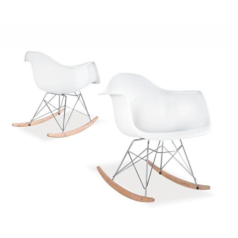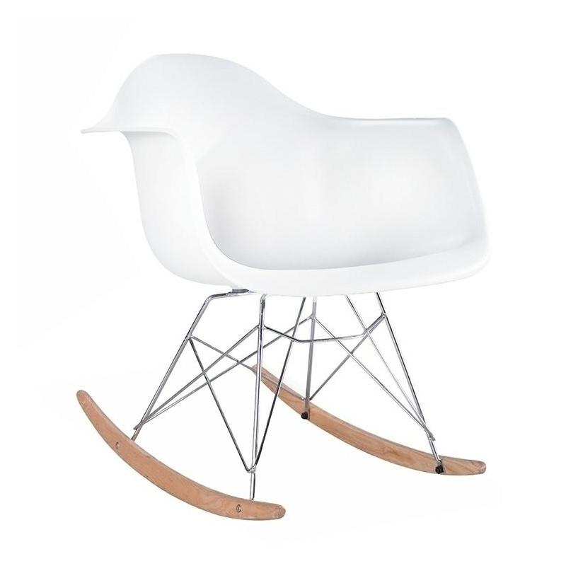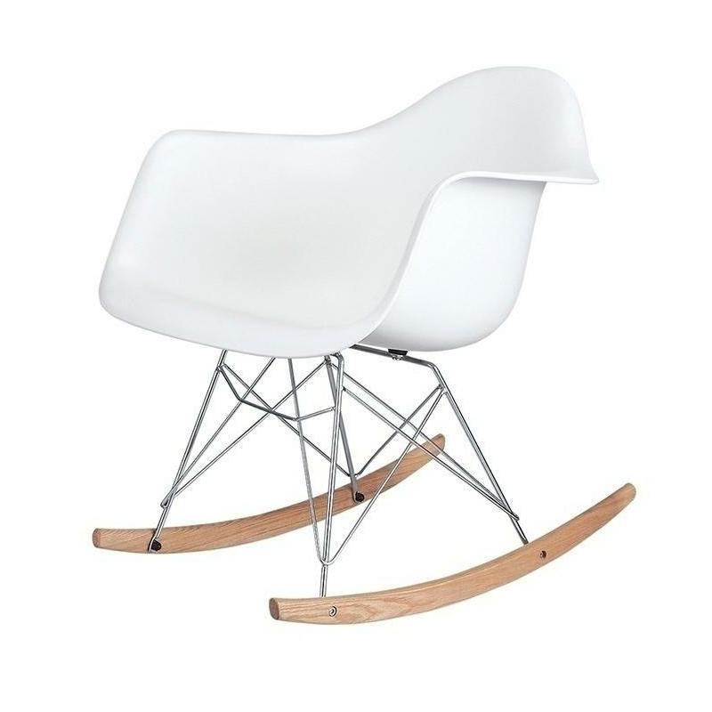 Fotel bujany Vild Rar. Korpus został wykonany z polipropylenu w kolorze białym matowym. Stelaż został zrobiony ze stali polerowanej. Płozy z drewna bukowego.Sposób wysyłki: Paczka Produkt do samodzielnego montażu: Tak Wymiar paczki: 64 cm x 64 cm x 64 cm