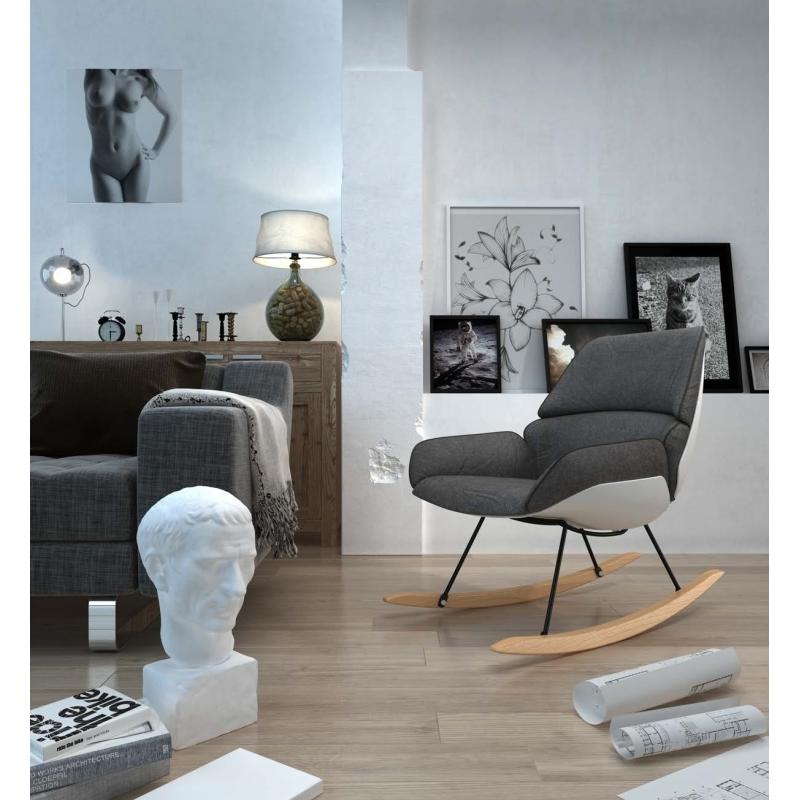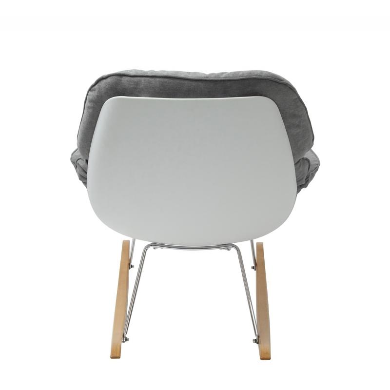 Fotel bujany NINO. Korpus z tworzywa sztucznego w białym matowym kolorze. Siedzisko to miękka i wygodna poducha obszyta tkaniną w kolorze jasny szary (90% poliester, 10% nylon). Poduchę można w łatwy sposób odpiąć od korpusu, dzięki czemu łatwiej można dbać o czysztość fotela. Poduchy można prać w pralce (30 C) Stelaż stal polerowana. Płozy wykonane z drewna bukowego.Waga netto 1 szt.: 9 kg Waga opakowania: 14 kg Maksymalne obciążenie 150 kg Wymiar opakowania: 72 cm x 72 cm x 64 cm Sposób wysy