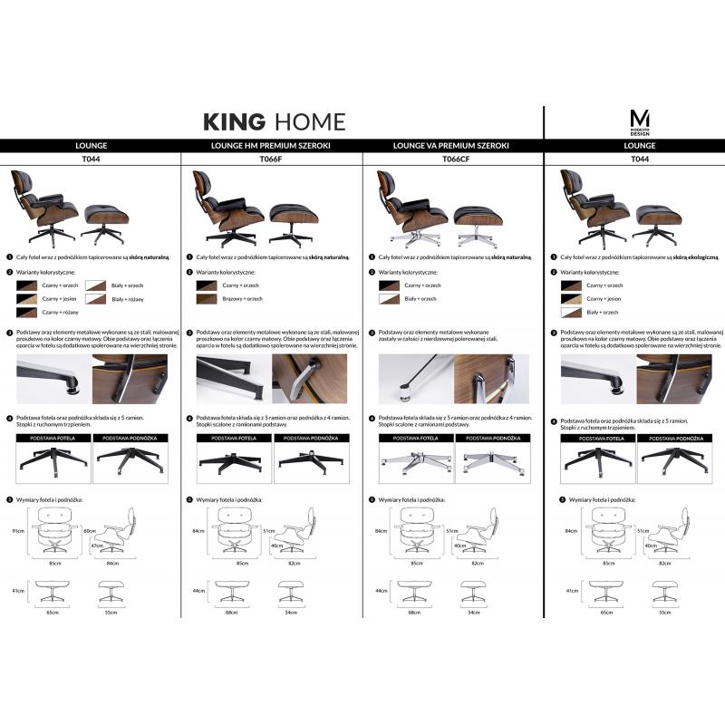 Fotel LOUNGE HM PREMIUM SZEROKI czarny z orzechowym drewnem. Cały fotel tapicerowany jest naturalną włoską skórą w kolorze czarnym. Korpus fotela jak i podnóżka został wykonany z giętego na ciepło drewna w kolorze orzechowym. Podstawy oraz elementy metalowe wykonane zostały ze stali, malowanej proszkowo na kolor czarny matowy. Dla podkreślenia elegancji, obie podstawy oraz łączenia oparcia w fotelu są dodatkowo spolerowane na wierzchniej stronie. Fotel jest obrotowy. Doskonale sprawdzi się w gab