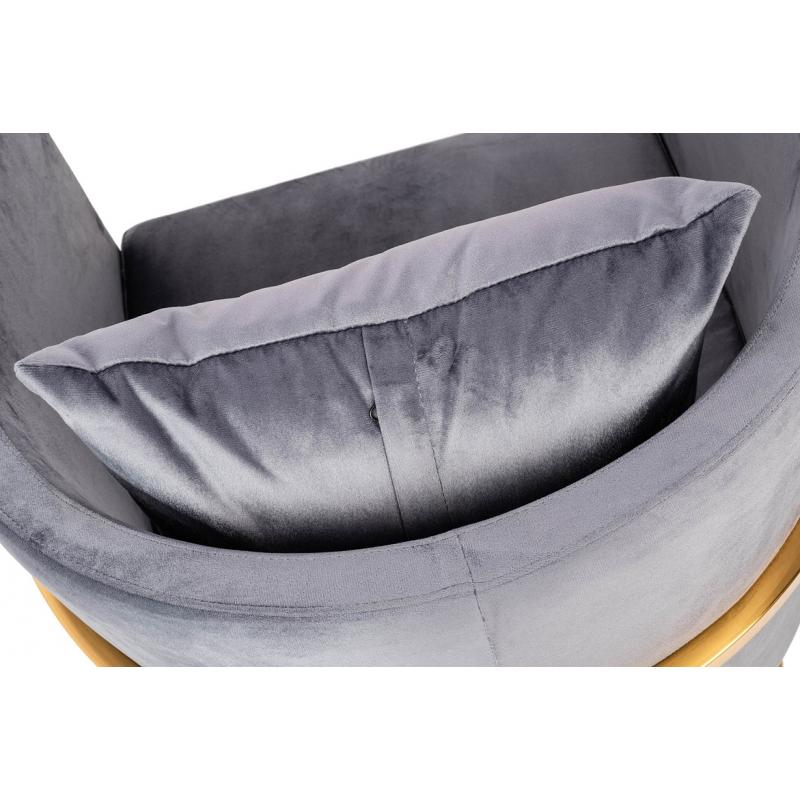 Fotel CHLOE. Siedzisko oraz poduszka tapicerowane są aksamitnym welurem w kolorze ciemnej szarości. Metalowa podstawa w kolorze złotym podkreśla nowoczesny styl fotela. Możliwość personalizacji obicia oraz wyjątkowy design sprawia, że Chloe doskonale odnajdzie się w każdej aranżacji.Głębokość siedziska: 54 cm Wymiar poduszki: 40 cm x 40 cm x 15 cm Waga netto 1 szt.: 8 kg.
