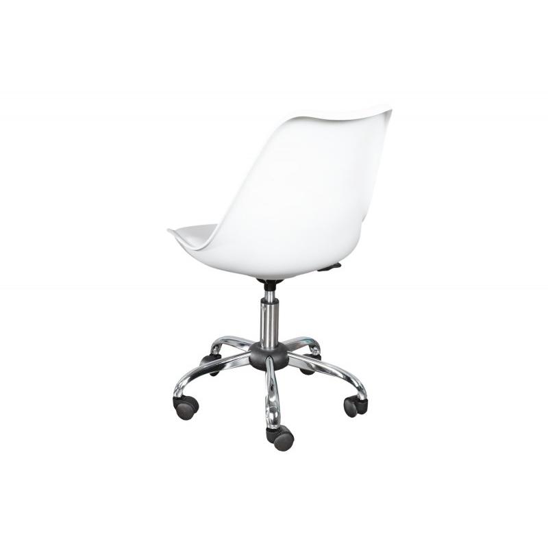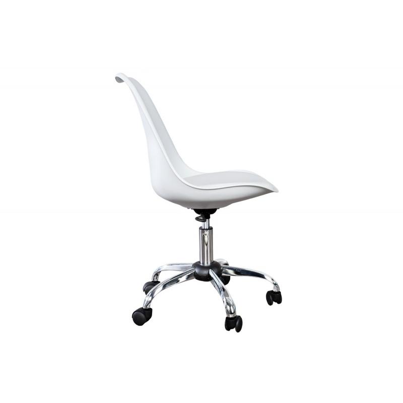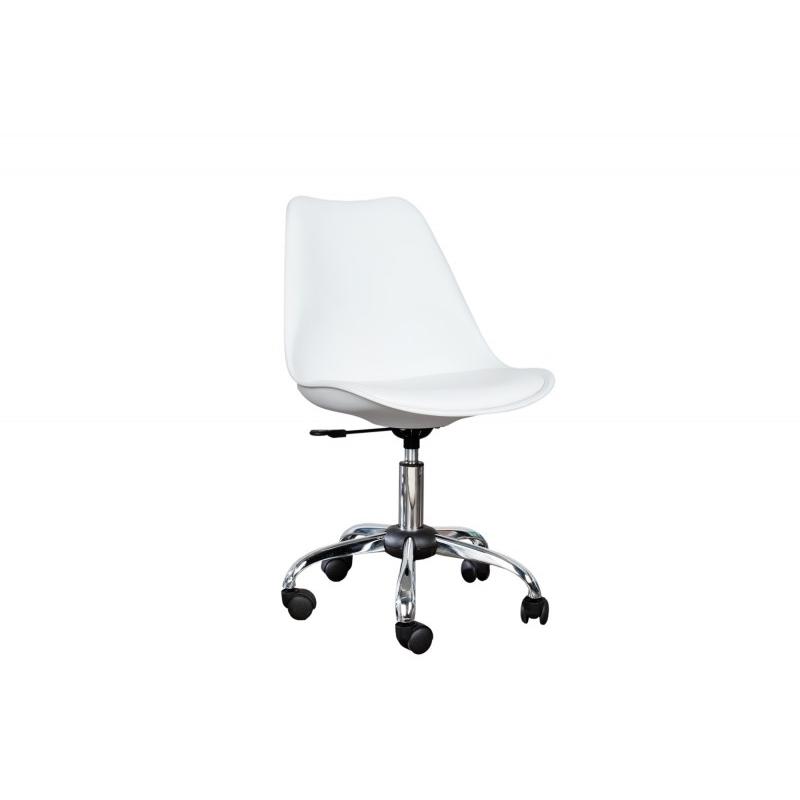 Krzesło biurowe SCANDINAVIA-To prostej budowy krzesło biurowe, które sprawdzi się świetnie w pokoju młodzieżowym lub w wielu firmach czy też korporacjach. Został zaprojektowany tak, aby móc w sposób funkcjonalny i użyteczny, pomagać pracownikom podczas pracy. Siedzisko jest w 100% poliuteranu w kolorze białym. Podstawa wykonana jest z chromowanej ramy na kółkach, które ułatwiają przemieszczanie się. Produkt, w stylu retro, klasyczny i bardzo często spotykany.Wymiary krzesła: Szerokość: 57 cm Wysokość: 80-90 cm Głębokość: 57 cmSiedzisko: Szerokość: 44 cm Wysokość: 36-46 cm Głębokość: 40 cm.