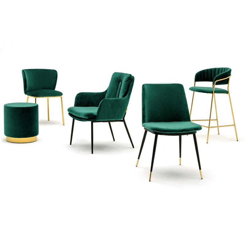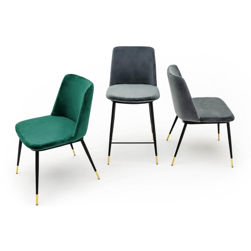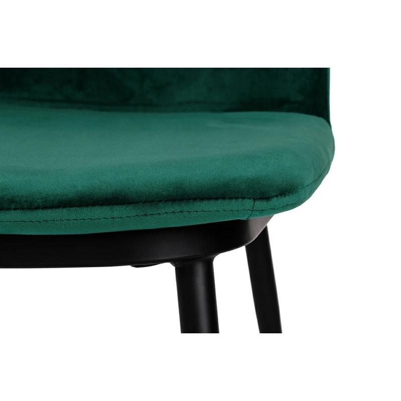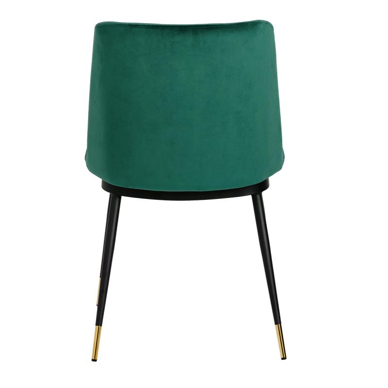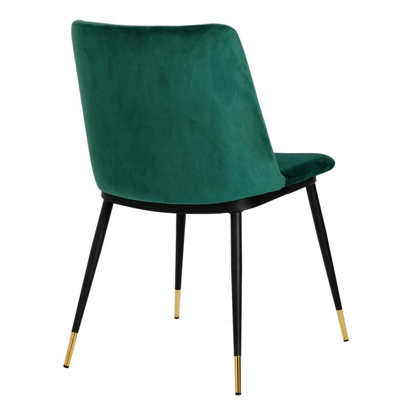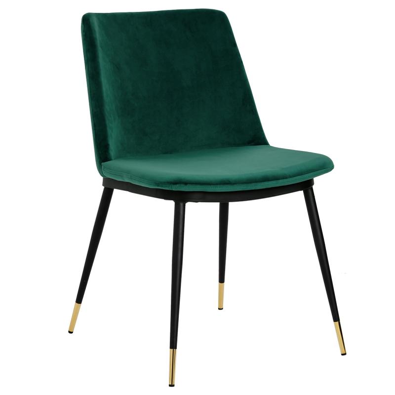 Krzesło Diego w kolorze zielonym. Siedzisko i oparcie tapicerowane miękkim i przyjemnym w dotyku welurem. Konstrukcja z metalu w kolorze czarnym z satynowym wykończeniem. Ciekawym elementem dekoracyjnym są złote zakończenia nóg. Krzesło doskonale odnajdzie się w jadalni, gabinecie oraz pokoju dziennym.Wysokość oparcia: 37,5 cm Głębokość siedziska; 46 cm Waga netto 1 szt.: 7,5 kg. Waga z opakowaniem: 15,6 kg. Wymiary opakowania: 66 cm x 60 cm x 61 cm. Sposób wysyłki: Paczka Produkt złożony: Nie
