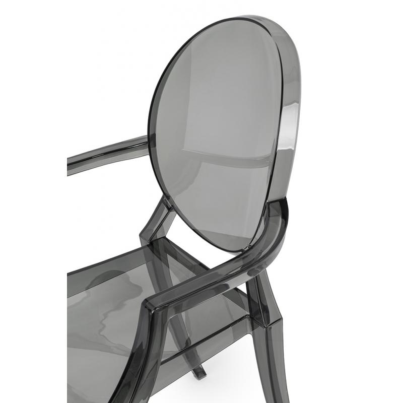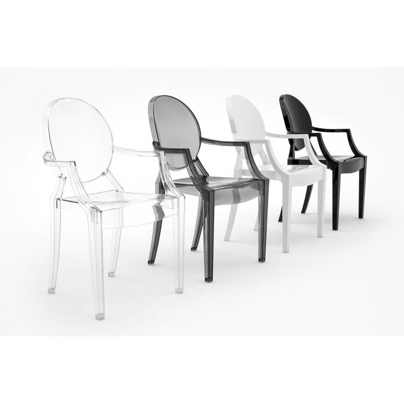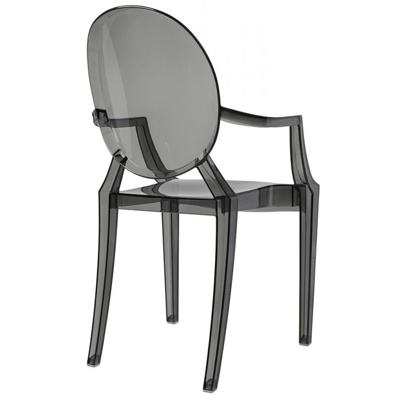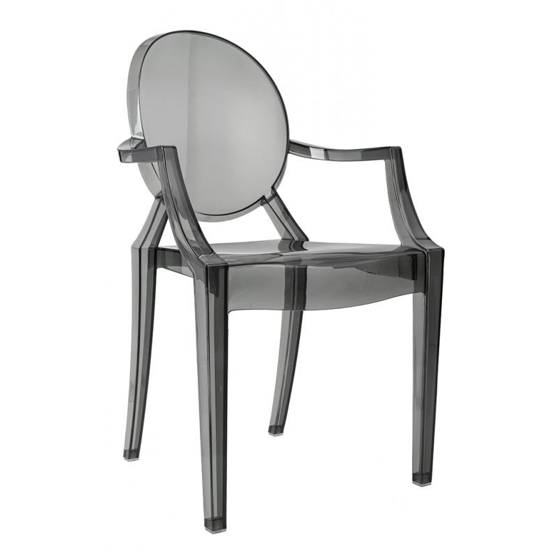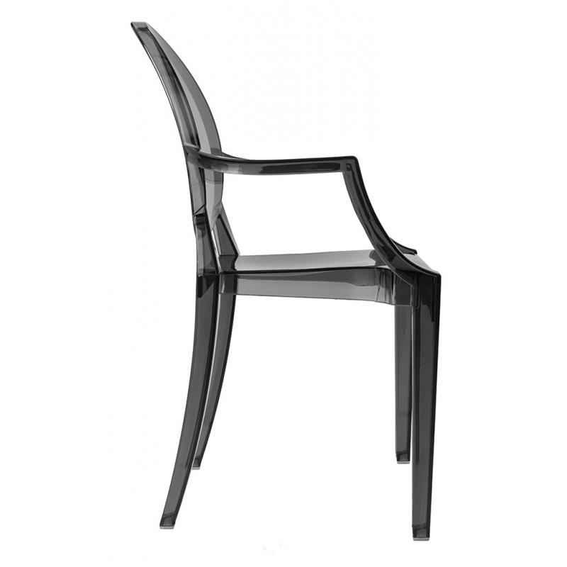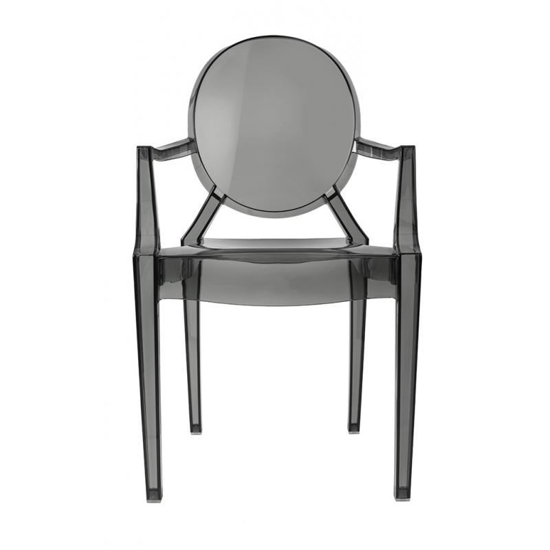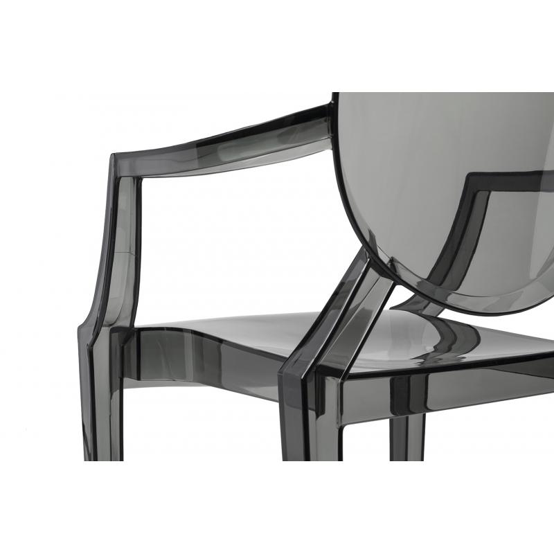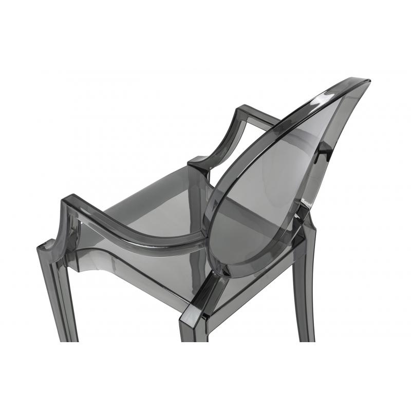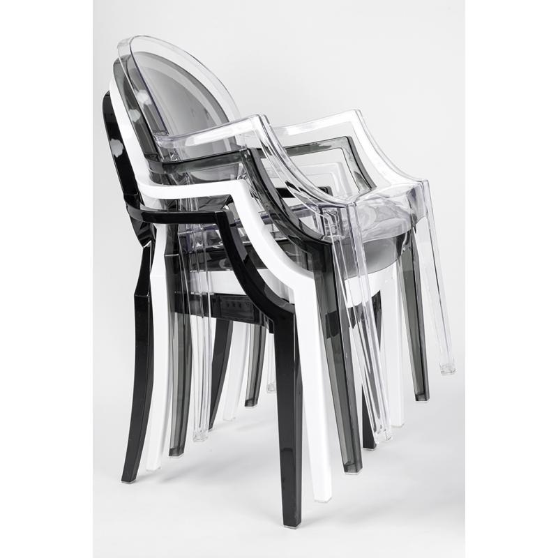 Krzesło Louis dymione. Jest to bardzo wytrzymałe tworzywo, cechujące się dużą wytrzymałością (do 150 kg) oraz odpornością na uderzenia. Model ten nawiązuje stylem do mebli w stylu Ludwika XV. Dzięki zastosowaniu przezroczystego materiału, krzesło optycznie nie zabiera miejsca. Dużym atutem jest możliwość sztaplowania (ustawiania jednego na drugim) ułatwia to przechowywanie krzesła. Krzesło wyposażone jest w cztery gumowe podkładki o grubości 5 mm, które zabezpieczają podłoże przed uszkodzeniem,Szerokość siedziska: 43 cm Głębokość siedziska: 57 cm Wysokość oparcia: 47,5 cm Szerokość oparcia: 38,5 cm Rozstaw nóg (szerokość): 50,5 cm Rozstaw nóg (głębokość): 49 cm Waga netto 1 szt.: 4 kg Wymiary opakowania: 56 cm x 76 cm x 106 cm. Sposób wysyłki : Paczka Produkt złożony: Tak.
