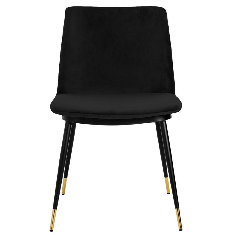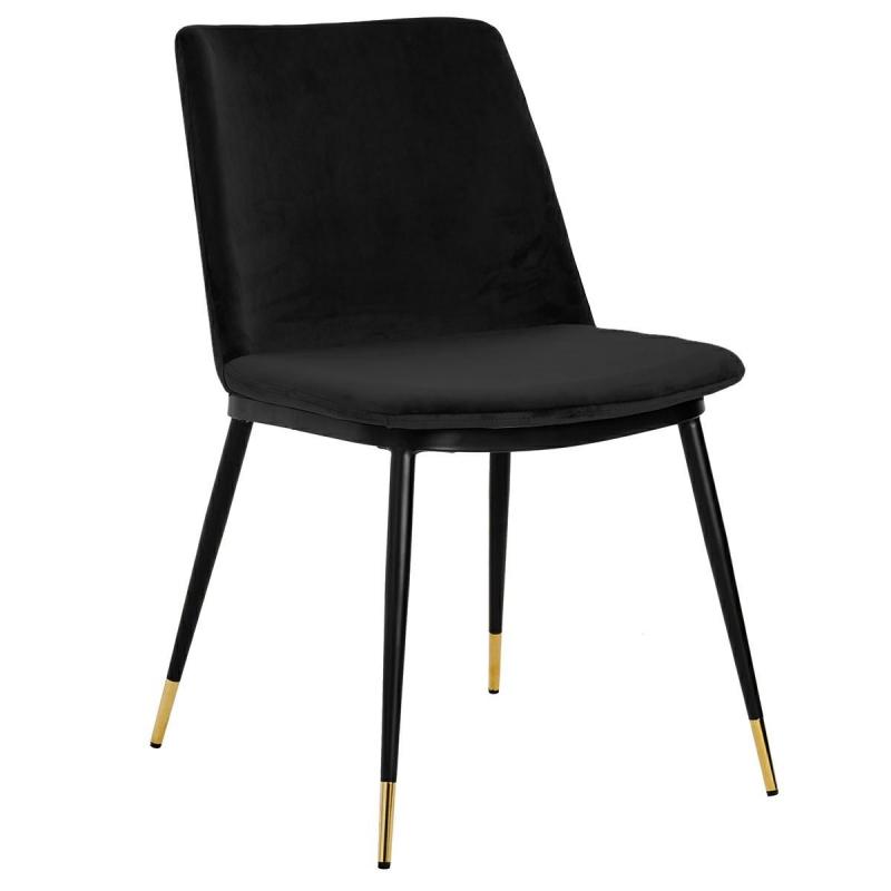 Krzesło Diego w kolorze czarnym. Siedzisko i oparcie tapicerowane miękkim i przyjemnym w dotyku welurem. Konstrukcja z metalu w kolorze czarnym z satynowym wykończeniem. Ciekawym elementem dekoracyjnym są złote zakończenia nóg. Krzesło doskonale odnajdzie się w jadalni, gabinecie oraz pokoju dziennym.Wysokość oparcia: 37,5 cm Głębokość siedziska; 46 cm Waga netto 1 szt.: 7,5 kg. Waga z opakowaniem: 15,6 kg. Wymiary opakowania: 66 cm x 60 cm x 61 cm. Sposób wysyłki: Paczka Produkt złożony: Nie