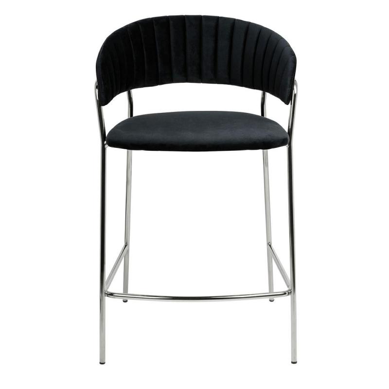 Krzesło barowe Margo w kolorze czarnym. Siedzisko i oparcie tapicerowane miękkim i przyjemnym w dotyku welurem. Mocna i stabilna konstrukcja wykonana została z metalu w kolorze błyszczącego chromu. Pionowe przeszycia na oparciu dodają elegancji. Margo idealnie odnajdzie się we wnętrzach nowoczesnych i klasycznych.Szerokość siedziska: 47 cm Głębokość siedziska: 43 cm Rozstaw nóg (szerokość): 53,5 cm Rozstaw nóg (głębokość): 54 cm Waga netto: 6 kg Wymiary opakowania: 105 cm x 54 cm x 64,5 cm.