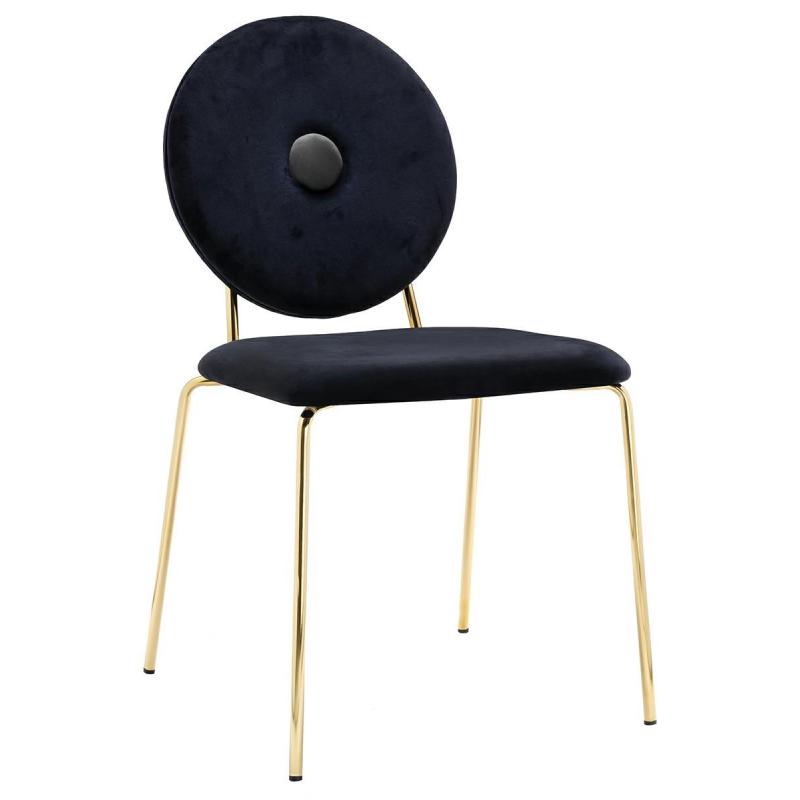 Krzesło Barocco w czarnym kolorze. Siedzisko i oparcie tapicerowane miękkim i przyjemnym w dotyku welurem. Dekoracyjny guzik na siedzisku, jest w kolorze szarym . Konstrukcja z metalu w kolorze złotym, błyszczącym. Barocco to doskonałe połączenie modnej tkaniny ze złotem. Krzesło idealnie pasujące do wnętrz nowoczesnych i klasycznych.Waga netto 1 szt.: 5,5 kg. Waga z opakowaniem: 7 kg. Wymiary opakowania: 86 cm x 63 cm x 55 cm. Sposób wysyłki: Paczka Produkt złożony: Tak
