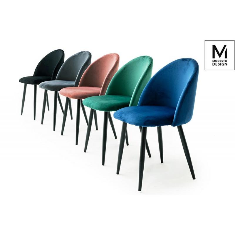 Krzesło NICOLE marki MODESTO DESIGN. Tapicerowane jest miękkim i przyjemnym w dotyku welurem w kolorze różowym. Stabilna podstawa została wykonana z metalu w kolorze czarnym matowym. Nicole to połączenie modnej tkaniny i klasycznej czerni.Waga netto 1 szt.: 6 kg. Waga z opakowaniem: 6,4 kg. Wymiary opakowania: 60 cm x 55 cm x 51 cm. Sposób wysyłki: Paczka Produkt złożony: Nie.