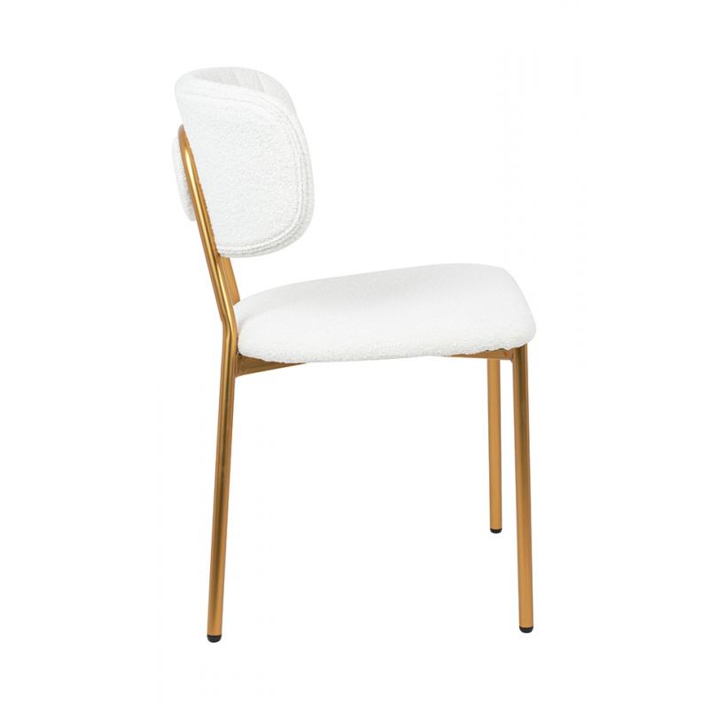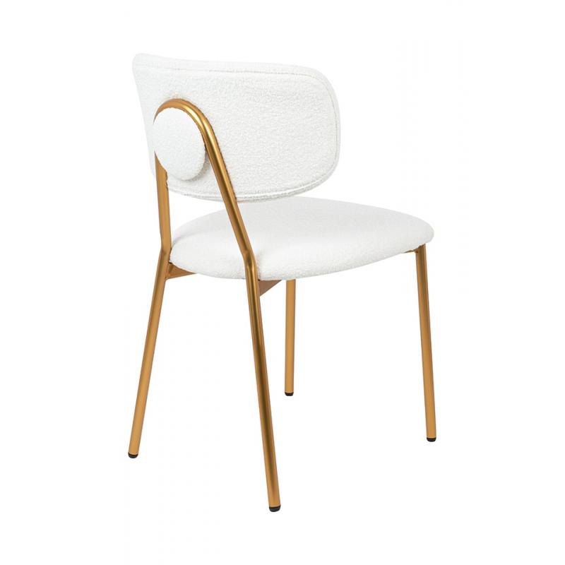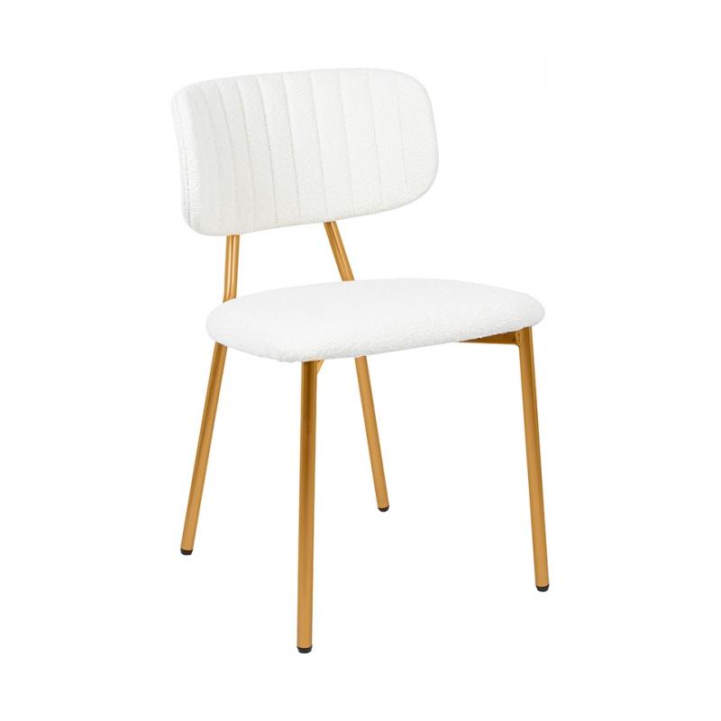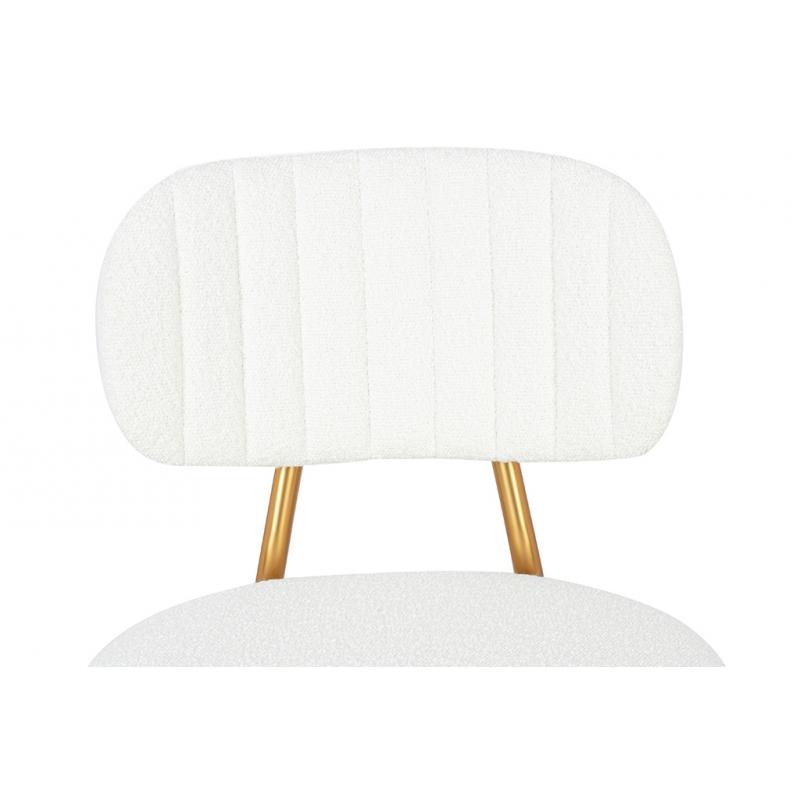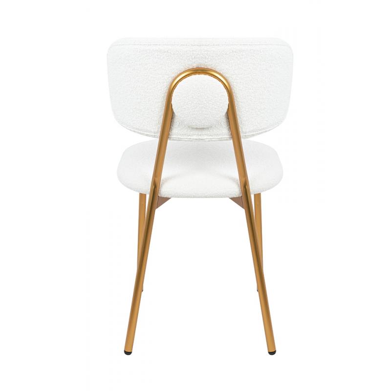 Krzesło FABIOLA BOUCLE białe. Oparcie i siedzisko tapicerowane są przyjemną, miękką w dotyku tkaniną boucle w kolorze białym. Podstawa została wykonana z metalu lakierowanego na kolor satynowego złota. Przeszycia na oparciu podkreślają nowoczesny charakter krzesła, a struktura materiału uczyni wnętrze szykownym i przytulnym.Siedzisko: szer. 48 cm / gł. 49 cm Oparcie: wys. 37 cm / szer. 45 cm Rozstaw nóg: szer. 43 cm / gł. 50 cm Waga netto: 6,4 kg Wymiar opakowania: 95 cm / 49 cm / 34 cm.