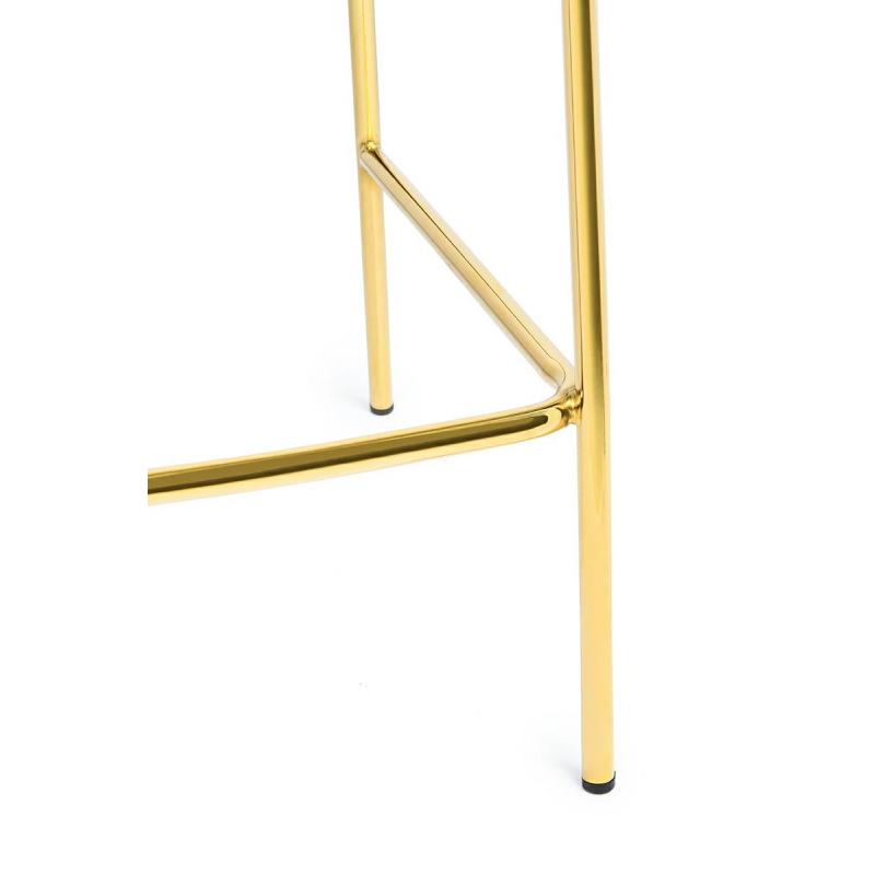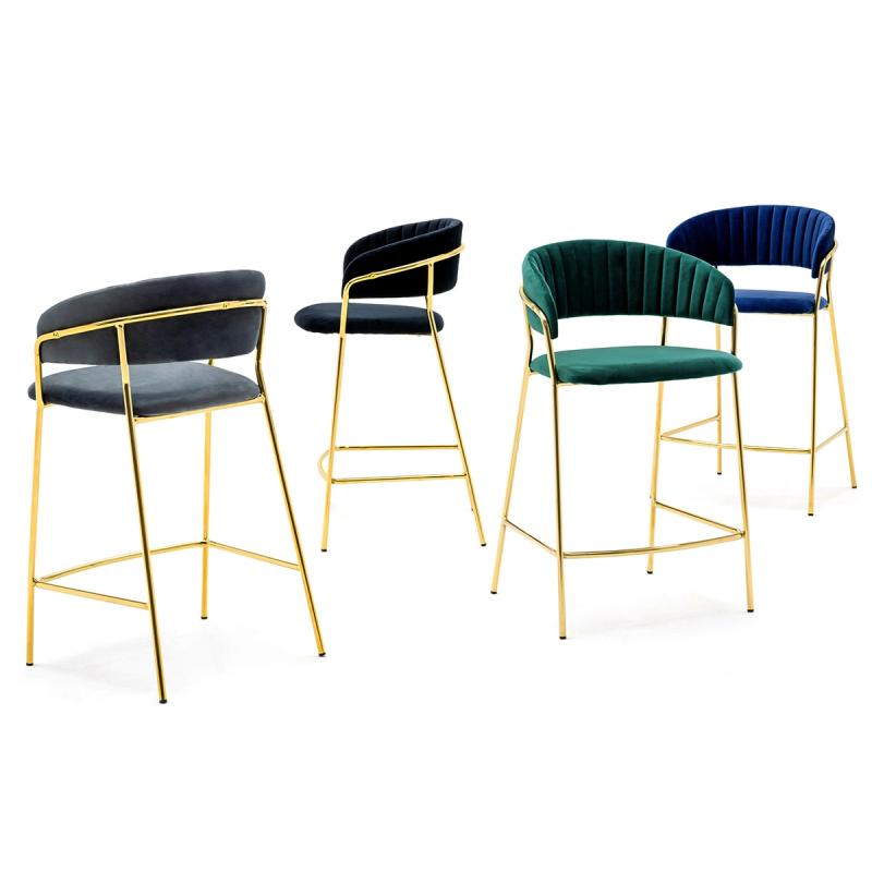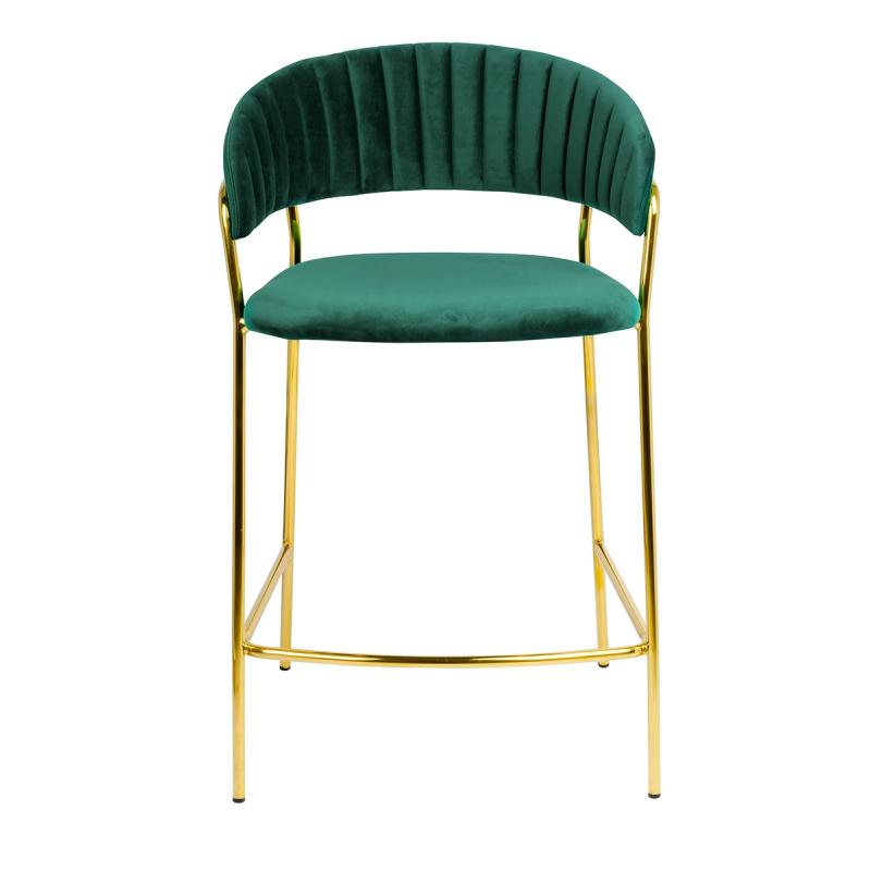 Krzesło barowe Margo w kolorze ciemnym zielonym. Siedzisko i oparcie tapicerowane miękkim i przyjemnym w dotyku welurem. Mocna i stabilna konstrukcja wykonana została z metalu w kolorze złotym, błyszczącym. Doskonałe połączenie modnej tkaniny i złota. Pionowe przeszycia na oparciu dodają elegancji. Margo idealnie odnajdzie się we wnętrzach nowoczesnych i klasycznych.Szerokość siedziska: 47 cm Głębokość siedziska: 43 cm Rozstaw nóg (szerokość): 53,5 cm Rozstaw nóg (głębokość): 54 cm Waga netto: 6 kg Wymiary opakowania: 105 cm x 54 cm x 64,5 cm.