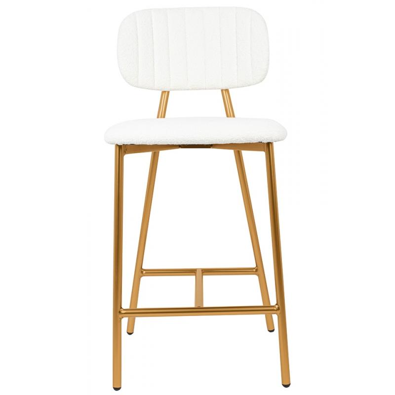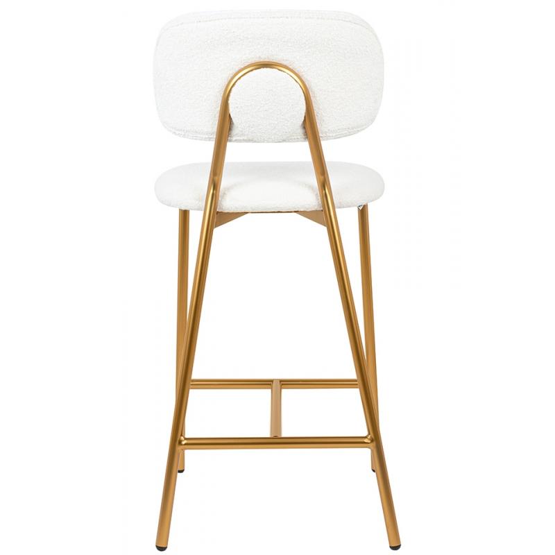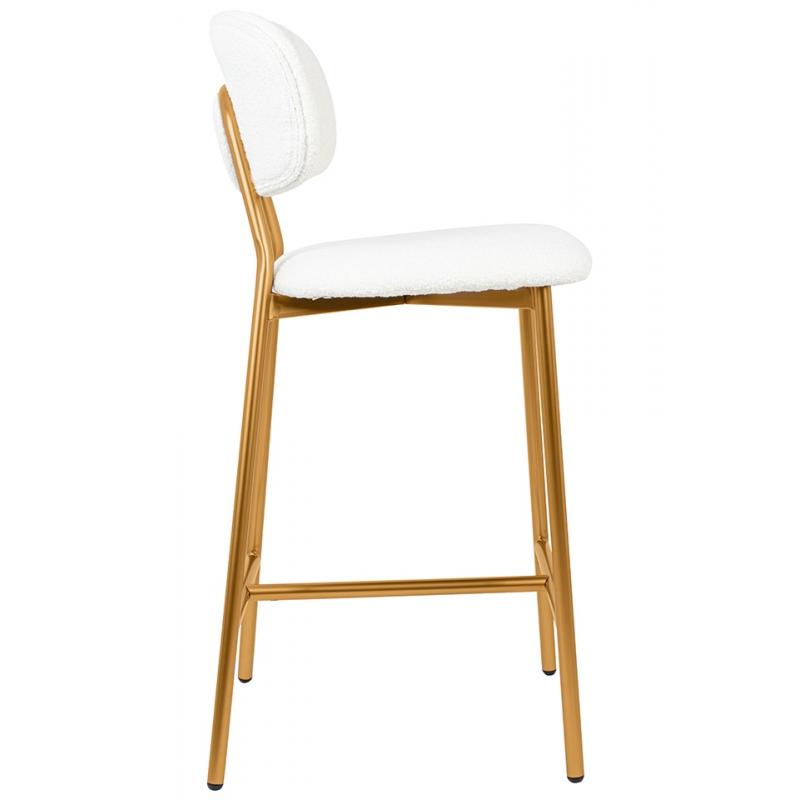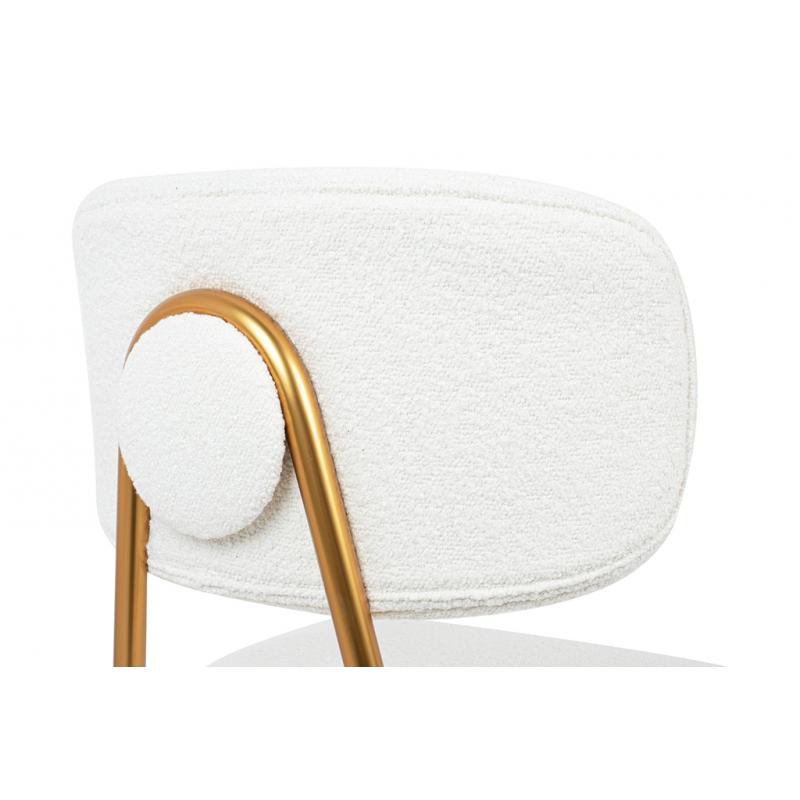 Krzesło barowe FABIOLA BOUCLE białe. Oparcie i siedzisko tapicerowane są przyjemną, miękką w dotyku tkaniną boucle w kolorze białym. Podstawa została wykonana z metalu lakierowanego na kolor satynowego złota. Przeszycia na oparciu podkreślają nowoczesny charakter krzesła, a struktura materiału uczyni wnętrze szykownym i przytulnym.Siedzisko: szer. 45 cm / gł. 41 cm Oparcie: wys. 33 cm / szer. 40 cm Rozstaw nóg: szer. 45 cm / gł. 45 cm Wysokość do podnóżka: 19 cm Waga netto: 6,8 kg Wymiar opakowania: 98,5 cm / 47 cm / 35 cm.