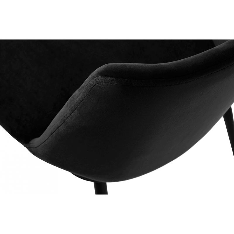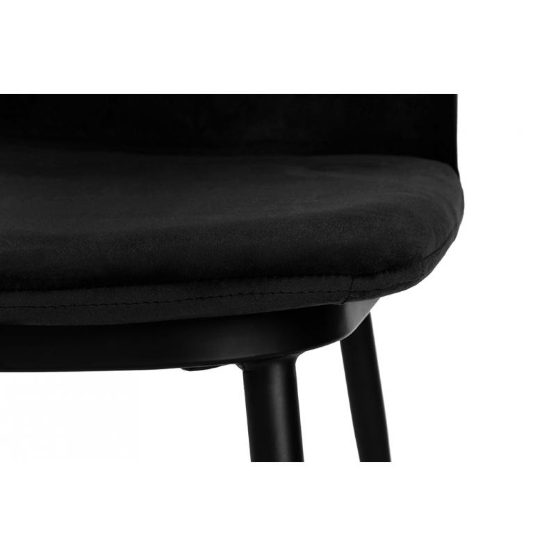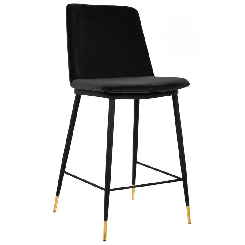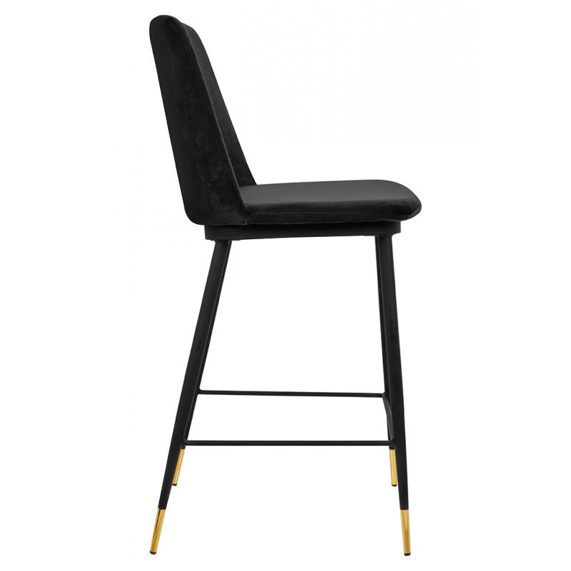 Krzesło barowe Diego w kolorze czarnym. Siedzisko i oparcie tapicerowane miękkim i przyjemnym w dotyku welurem. Konstrukcja z metalu w kolorze czarnym z satynowym wykończeniem. Ciekawym elementem dekoracyjnym są złote zakończenia nóg. Hoker doskonale odnajdzie się w kuchni oraz hotelowym barze.Wysokość oparcia: 34 cm Głębokość siedziska; 40 cm Waga netto 1 szt.: 7,8 kg. Wymiary opakowania: 76 cm x 49 cm x 65 cm.
