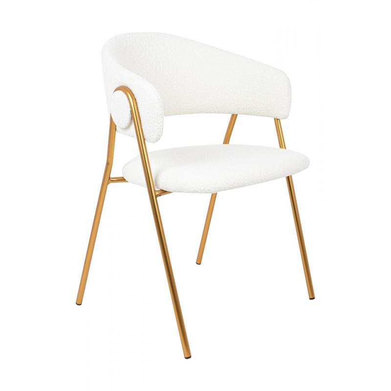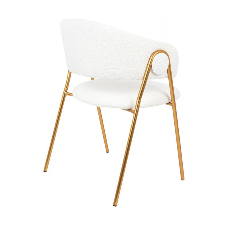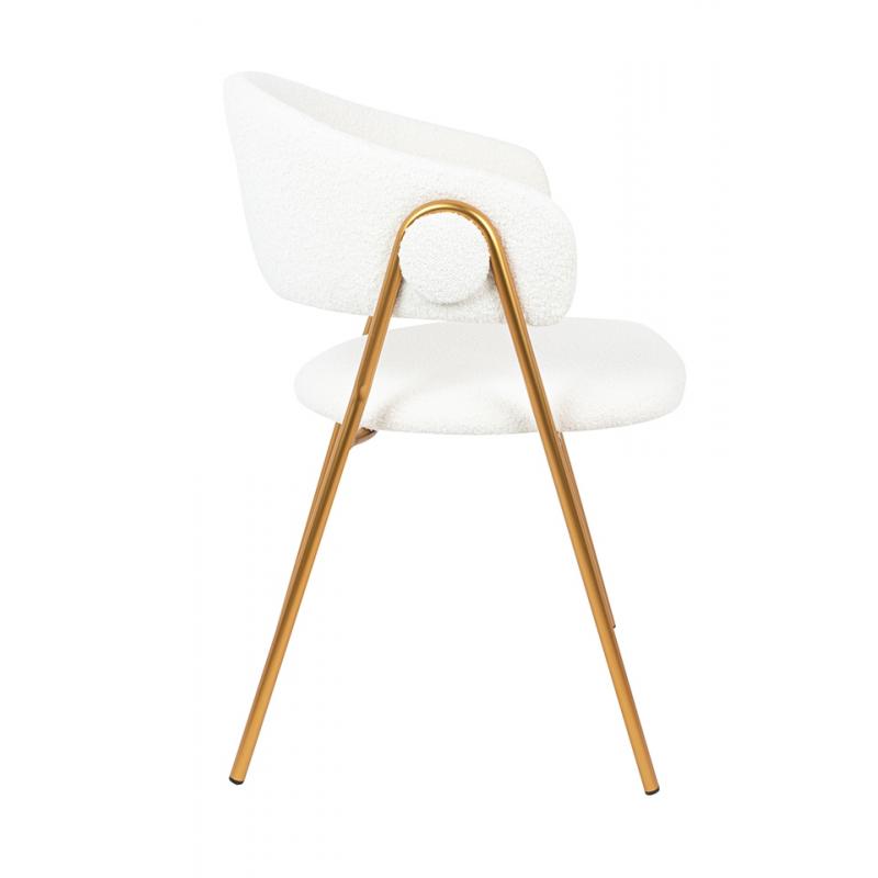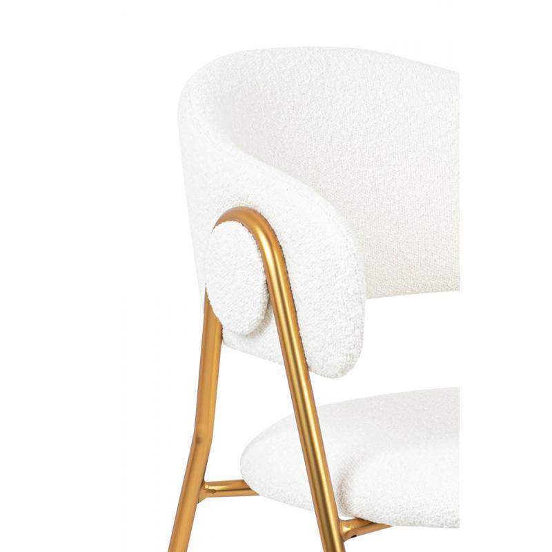 Krzesło VERSO BOUCLE białe. Oparcie i siedzisko tapicerowane są przyjemną, miękką w dotyku tkaniną boucle w kolorze białym. Podstawa została wykonana z metalu lakierowanego na kolor satynowego złota. Podłokietniki z dekoracyjnym akcentem potęgują komfort użytkowania. Nowoczesna struktura materiału uczyni wnętrze szykownym i przytulnym.Siedzisko: szer. 50 cm / gł. 49 cm Oparcie: wys. 38 cm / szer. 42 cm Rozstaw nóg: szer. 56 cm / gł. 49 cm Waga netto: 7,5 kg Wymiar opakowania: 57,5 cm / 82,5 cm / 61 cm.