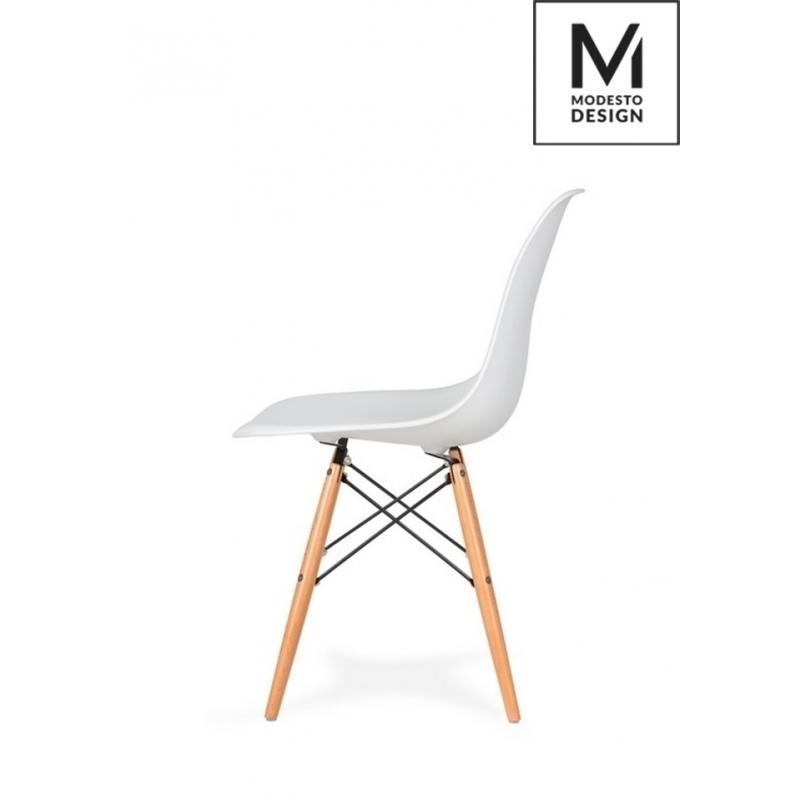 Krzesło DSW marki MODESTO DESIGN. Siedzisko i oparcie wykonane z tworzywa sztucznego w kolorze białym. Nogi drewno bukowe, łączenia stal lakierowana na czarno. Waga netto 1 szt.: 3.50 kg Waga opakowania: 4 kg Sposób wysyłki: Paczka Produkt do samodzielnego montażu: Tak Wymiary paczki: 58 cm x 56 cm x 52 cm