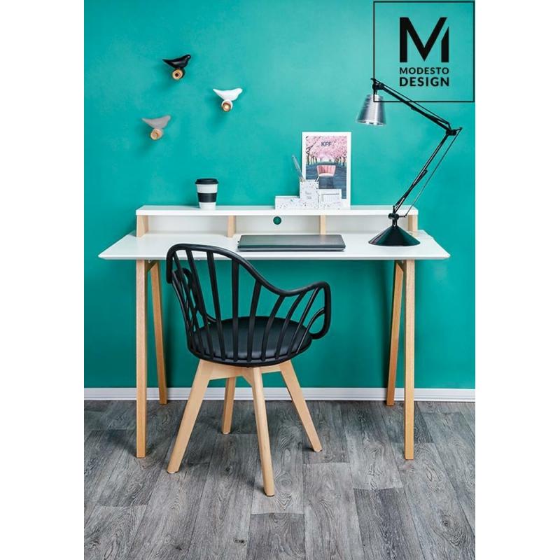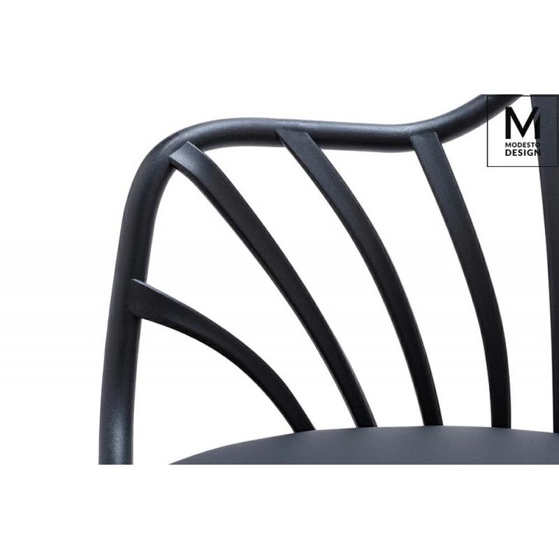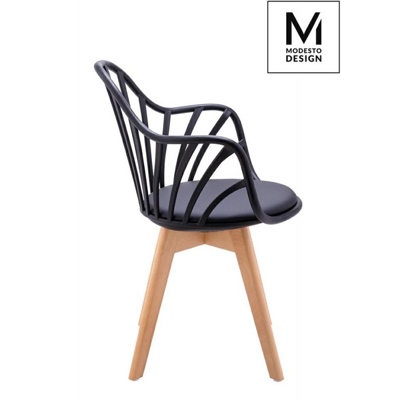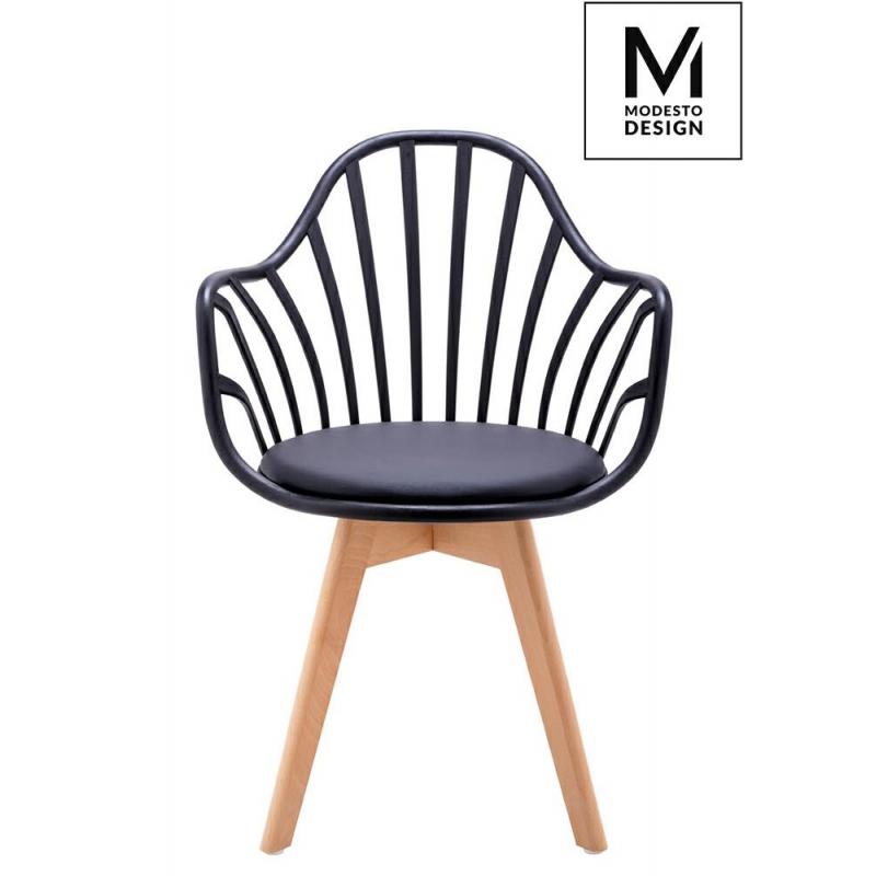 MODESTO krzesło ALBERT ARM marki MODESTO DESIGN. Klasyczne krzesło w nowoczesnym wydaniu. Konstrukcja wykonana z polipropylenu w kolorze czarnym matowym. Na siedzisku znajduje się miękka poduszka, tapicerowana czarną ekoskórą. Podstawa wykonana z naturalnego drewna bukowego. Doskonały fotel do jadalni lub salonu, sprawdzi się też przy biurku.Waga netto 1 szt.: 5 kg Waga z opakowaniem: 6 kg Wymiary paczki: 76 cm x 59 cm x 43 cm Sposób wysyłki: Paczka Produkt do samodzielnego montażu: Tak