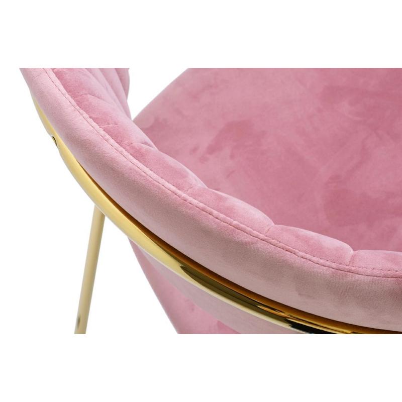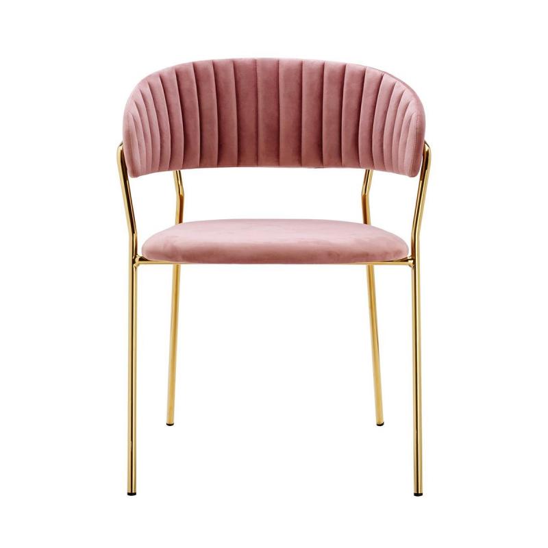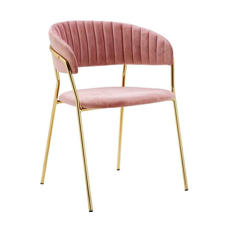 Krzesło Margo w modnym kolorze brudnego różu. Siedzisko i oparcie tapicerowane miękkim i przyjemnym w dotyku welurem. Konstrukcja z metalu w kolorze złotym, błyszczącym. Margo to doskonałe połączenie modnej tkaniny ze złotem. Pionowe przeszycia na oparciu dodają elegancji. Krzesło idealnie pasujące do wnętrz nowoczesnych i klasycznych.Szerokość siedziska: 48 cm Głębokość siedziska: 45 cm Wysokość oparcia: 34 cm Waga netto 1 szt.: 5,5 kg. Waga z opakowaniem: 7 kg. Wymiary opakowania: 78,5 cm x 58,5 cm x 63 cm. Sposób wysyłki: Paczka Produkt złożony: Tak