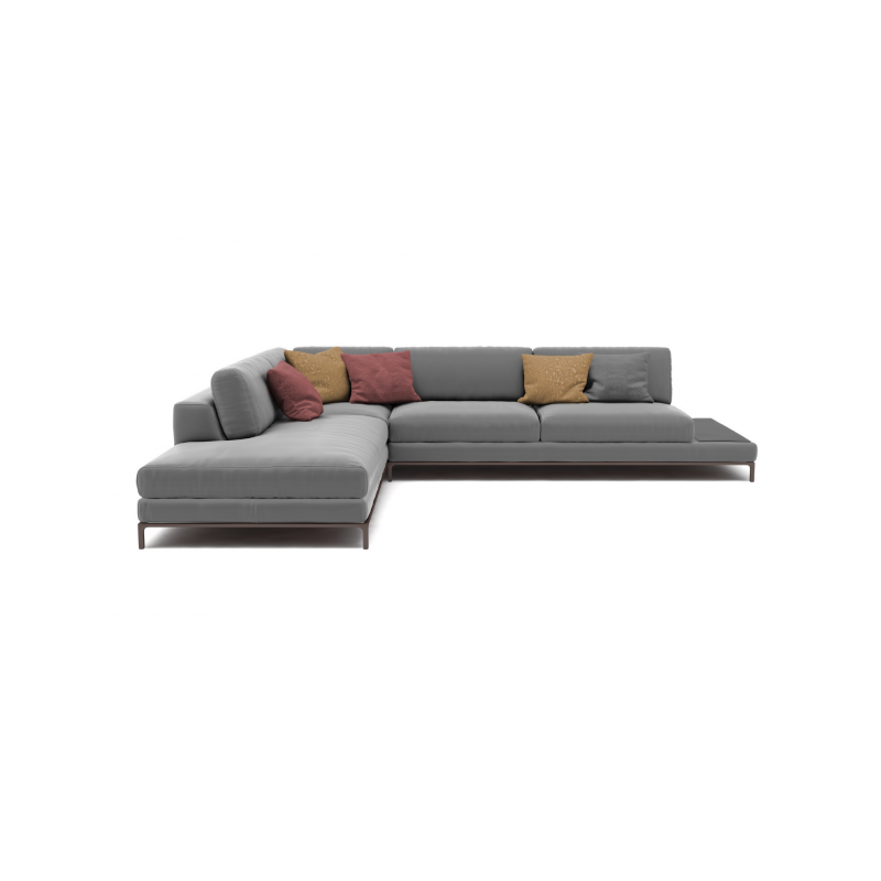 Narożnik w standardzie wyposażony został w funkcjonalną półkę dekoracyjną. Szerokie i wygodne siedziska będą idealnym miejscem do odpoczynku dla całej rodziny lub integracji w gronie przyjaciół i znajomych.