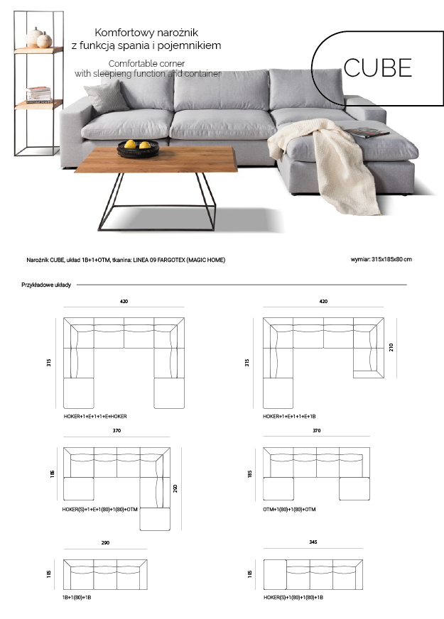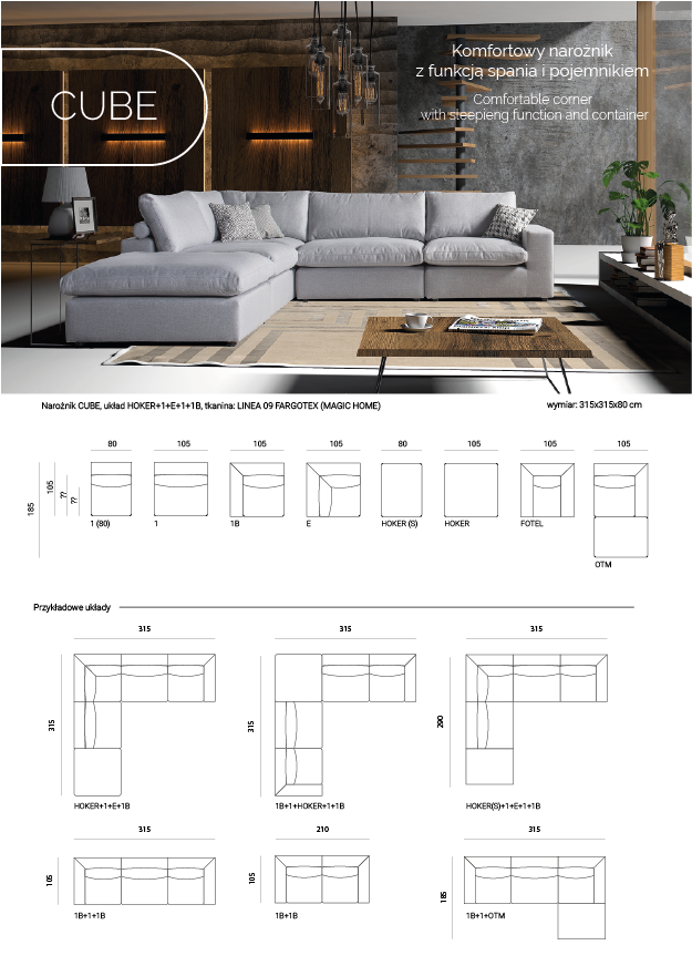 Narożnik CUBE prezentuje styl loftowy. Został tak skonstruowany, aby móc tworzyć swoją przestrzeń z dostępnych modułów. Mebel CUBE prezentuje prostotę w całej swojej klasie. Jest to nowoczesny i zarazem bardzo komfortowy mebel. Konstrukcja mebla została stworzona z litego drewna.