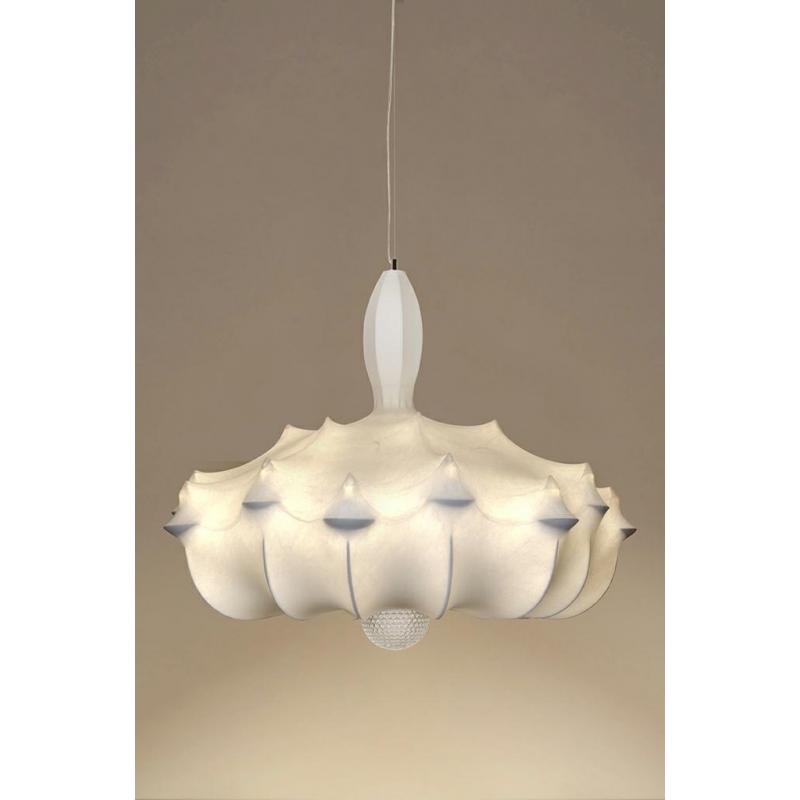 Lampa wykonana została z metalu, zakończona delikatnym szklanym kloszem. Całość otoczona jest materiałem kompozytowym, inspirowanym pajęczą siecią który oplata cała lampę.Światło: 6 x E27 max. 60 W (brak w zestawie) Oprawa: wys. 200 cm / szer. 180 cm Klosz: śr. 180 cm / wys. 130 cm Montaż: instalacja sufitowa Waga netto: 15 kg Wymiary opakowania: 200 cm / 200 cm / 150 cm Sposób wysyłki: paczka gabarytowa.